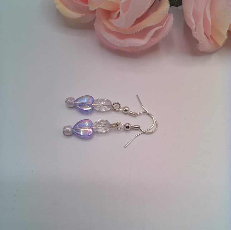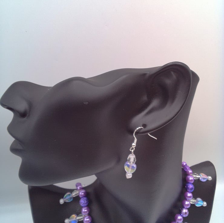 This pretty jewellery set comprises a necklace and a pair of earrings. It would be great to wear everyday or for an evening out. It is made using 6 mm and 8 mm purple pearls and 8 mm textured purple beads with dangles made using an opaque white seed bead, a 8 mm x 8 mm iridescent lilac heart and an 8 mm x 6 mm clear crystal tear drop bead. The necklace is 17 inches (43.5 cm) long and is fastened with a silver lobster clasp. The earrings have the dangles mentioned above suspended on silver plated hook ear wires. The necklace and earrings set will be dispatched wrapped in tissue paper in an organza bag and delivered to you via Royal Mail first class post. The set would look great for everyday wear and it would also make a lovely gift for a friend or relative for a birthday or anniversary, or a nice treat for yourself.
