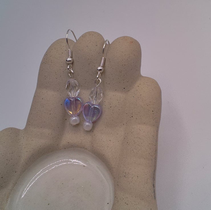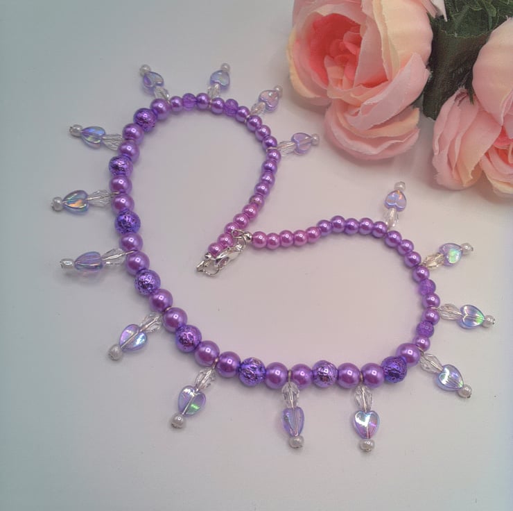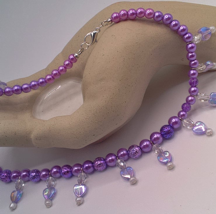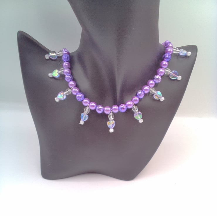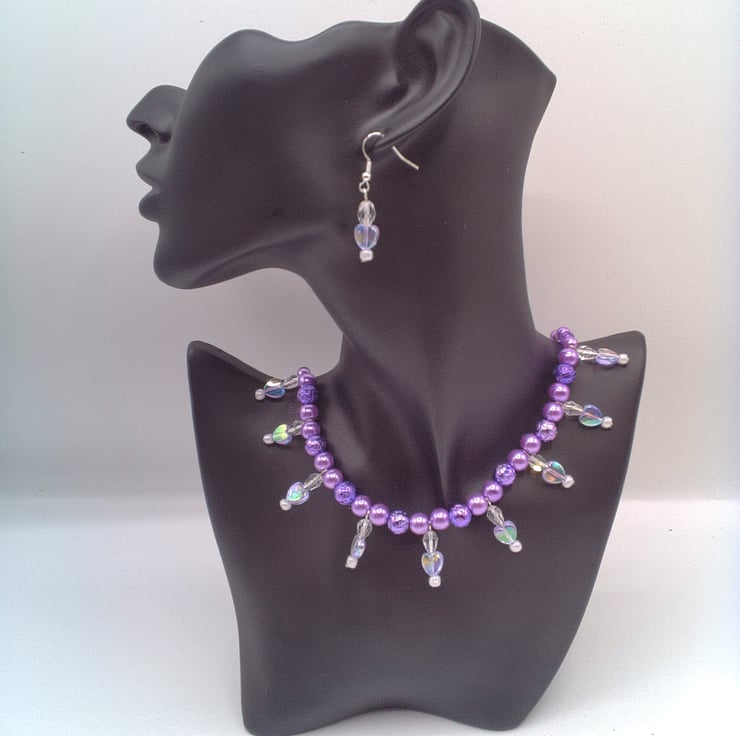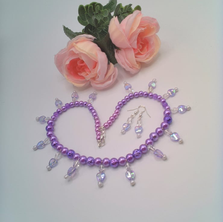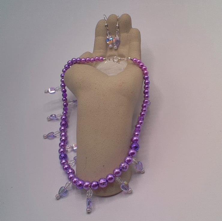 Purple and Lilac Pearl Crystal and Iridescent Hearts Necklace and Earrings, Heart Necklace, Heart Earrings, Beaded Necklace, Necklace, Earrings, Birthday Gift, Anniversary Gift, Gift for Her, Purple Bead Necklace, Purple Bead Earrings