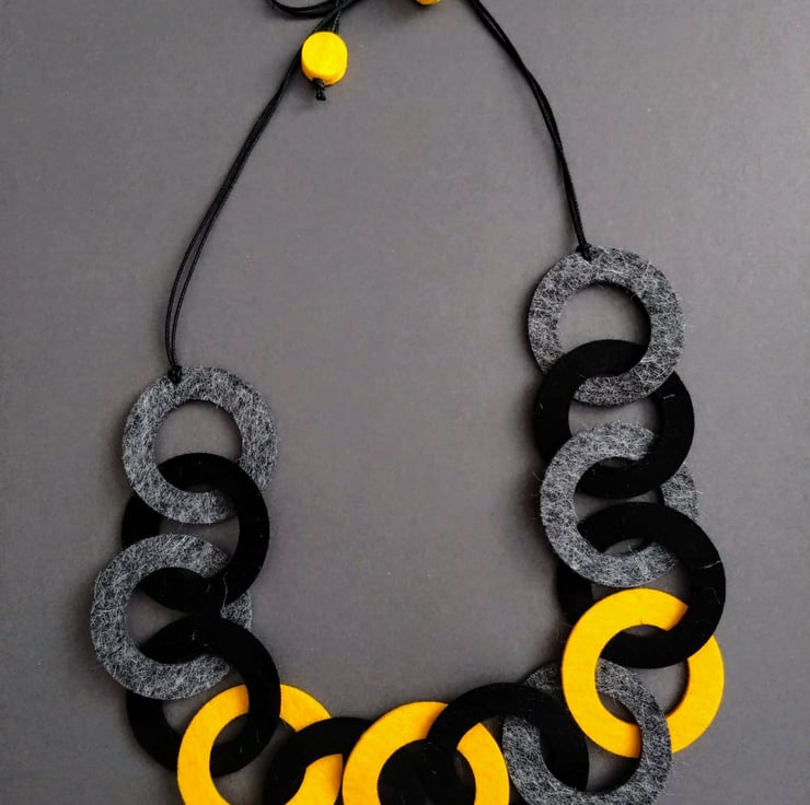 This striking necklace is made of 100% wool felt. It is heavy in appearance yet light in weight. The choice of contrasting colours makes it a piece that will get noticed. The length can be adjusted depending on your preference by simple ribbon knot or you can just put it over your head. If you would like to have same piece but in a deferent colours it can be done too.