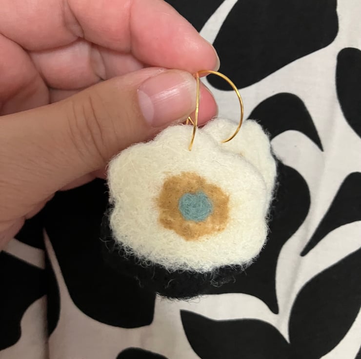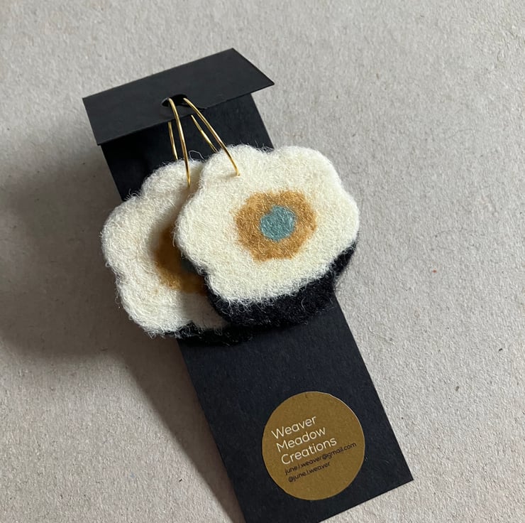 Hand felted , flower shaped earrings 4.5cm on gold coloured steel hoop 20mm