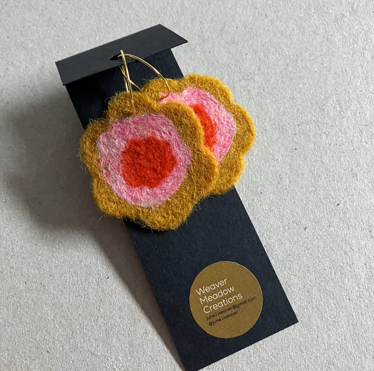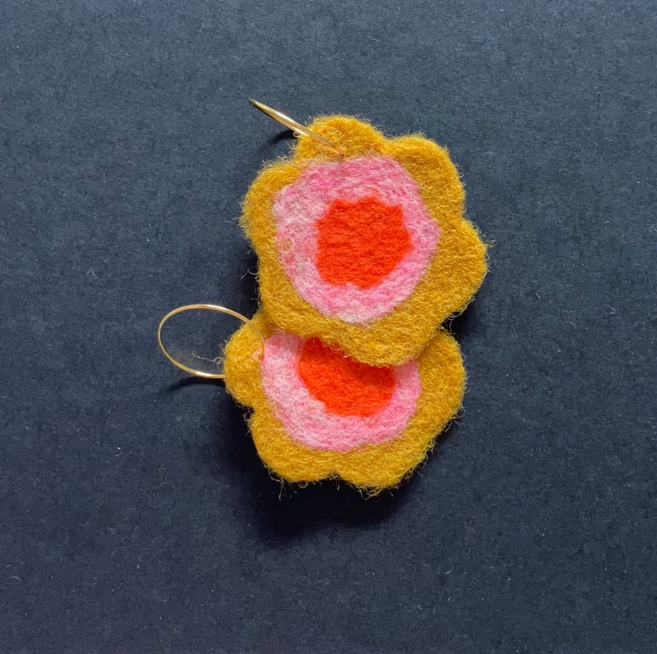 Hand felted , flower shaped earrings 4.5cm on gold coloured steel hoop 20mm