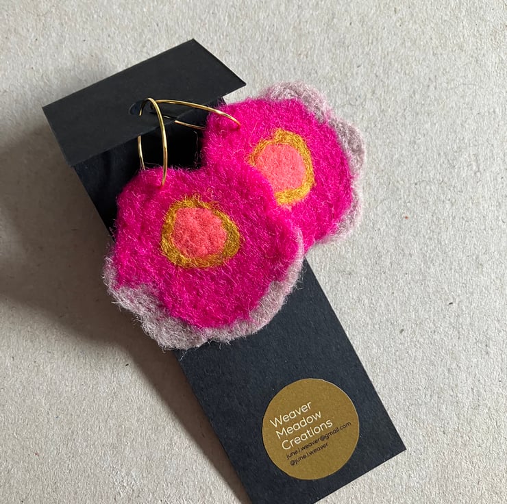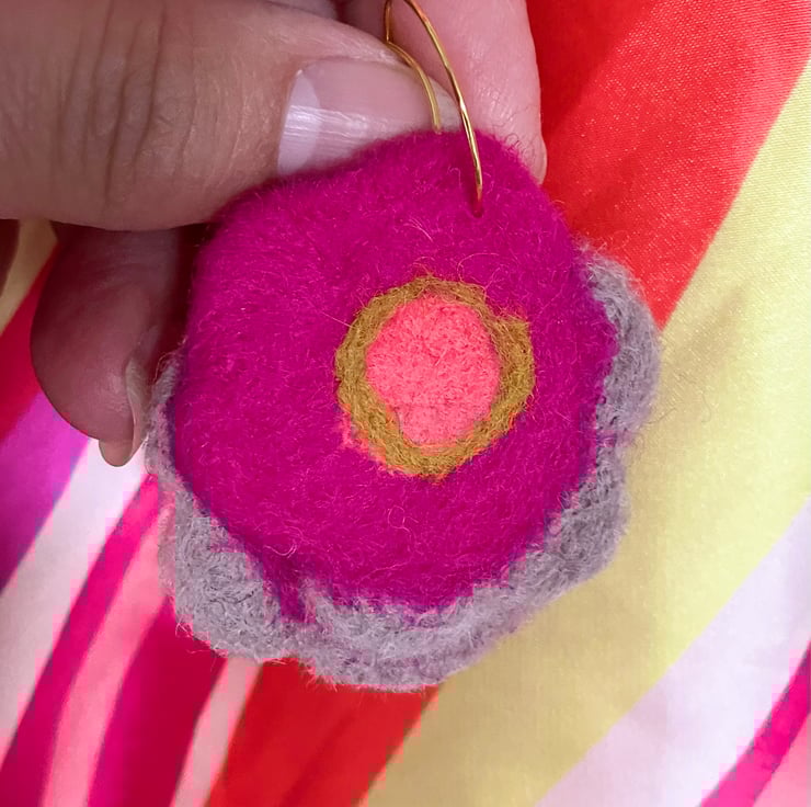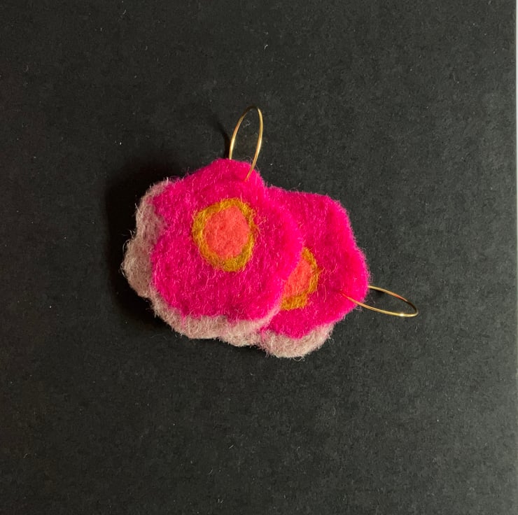 Hand felted , flower shaped earrings 4.5cm on gold coloured steel hoop 20mm