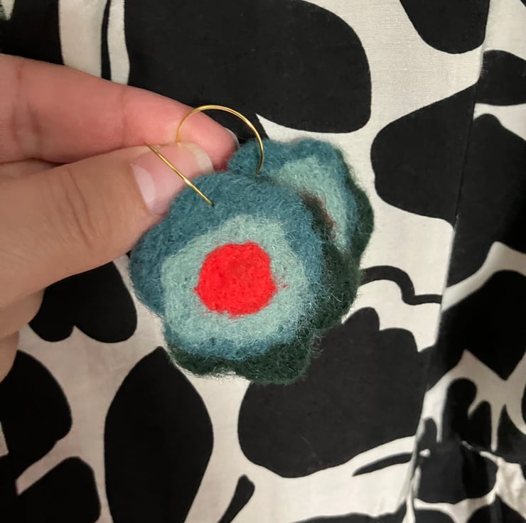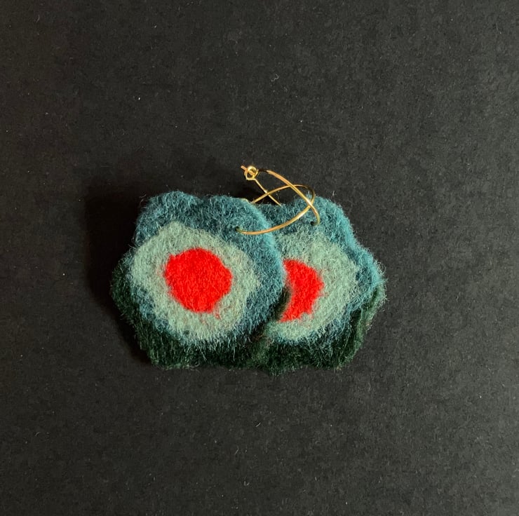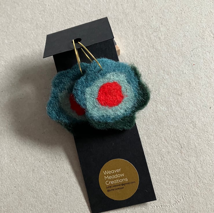 Hand felted , flower shaped earrings 4.5cm on gold coloured steel hoop 20mm
