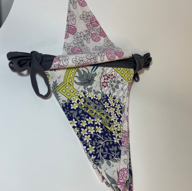 This bunting is made from an unwanted duvet cover that was bought in a charity shop. It was in such good condition apart from one corner where someone had spilt blackcurrant juice. I thought the material would make lovely bunting. Any garden party or tea party celebration would look fantastic with this hanging up to bring some extra cheer.