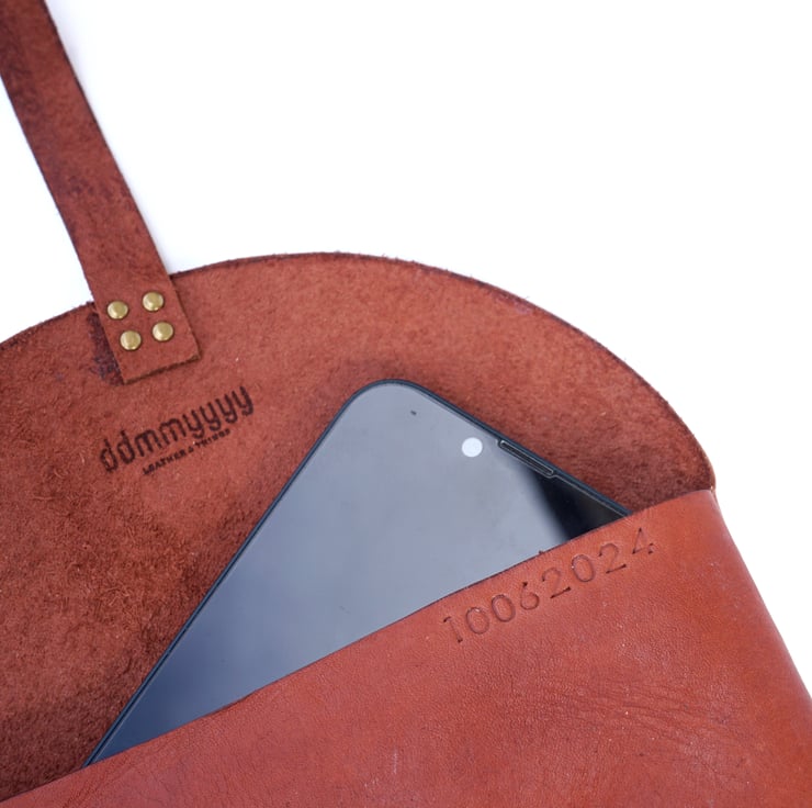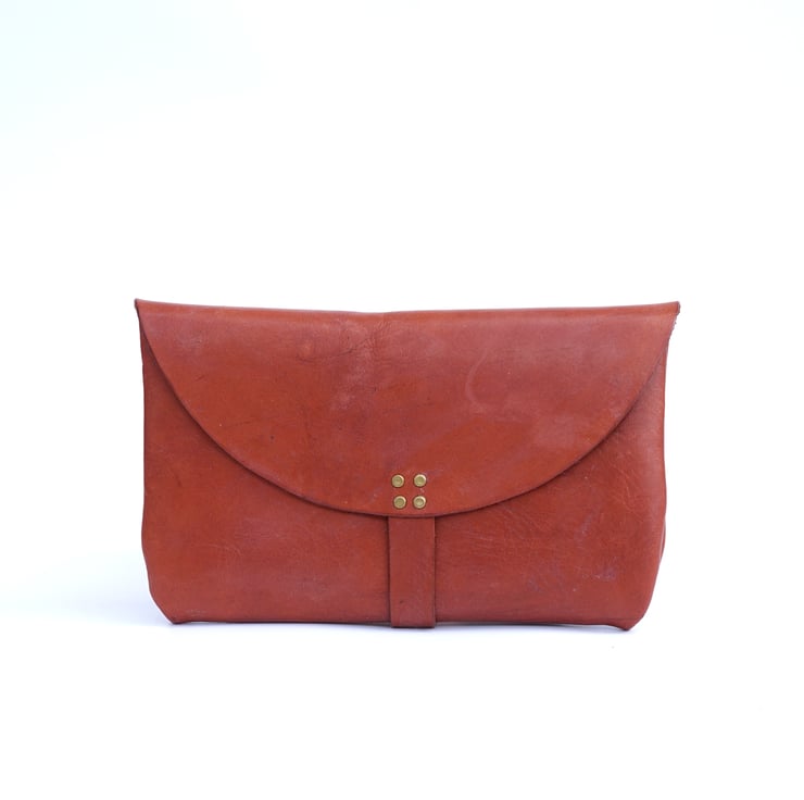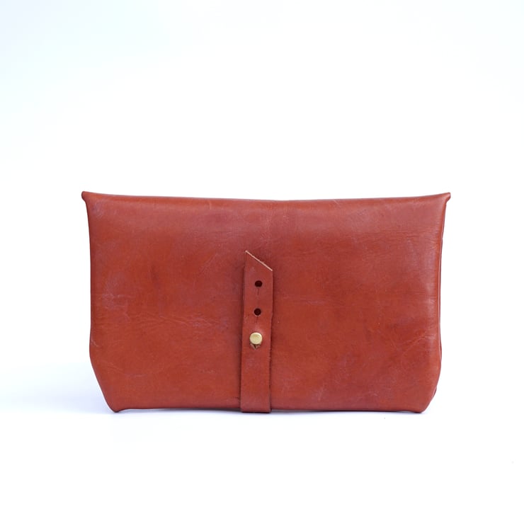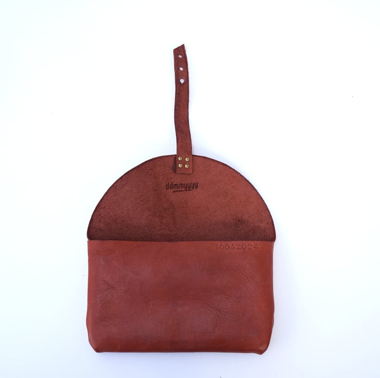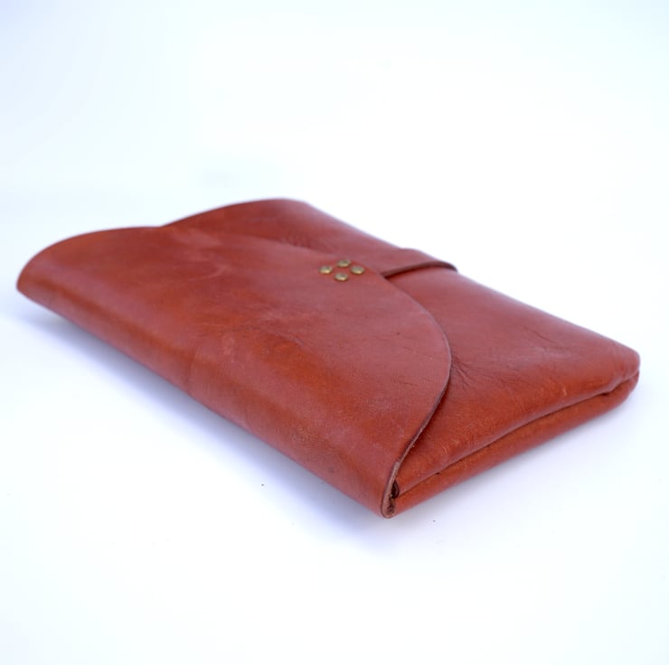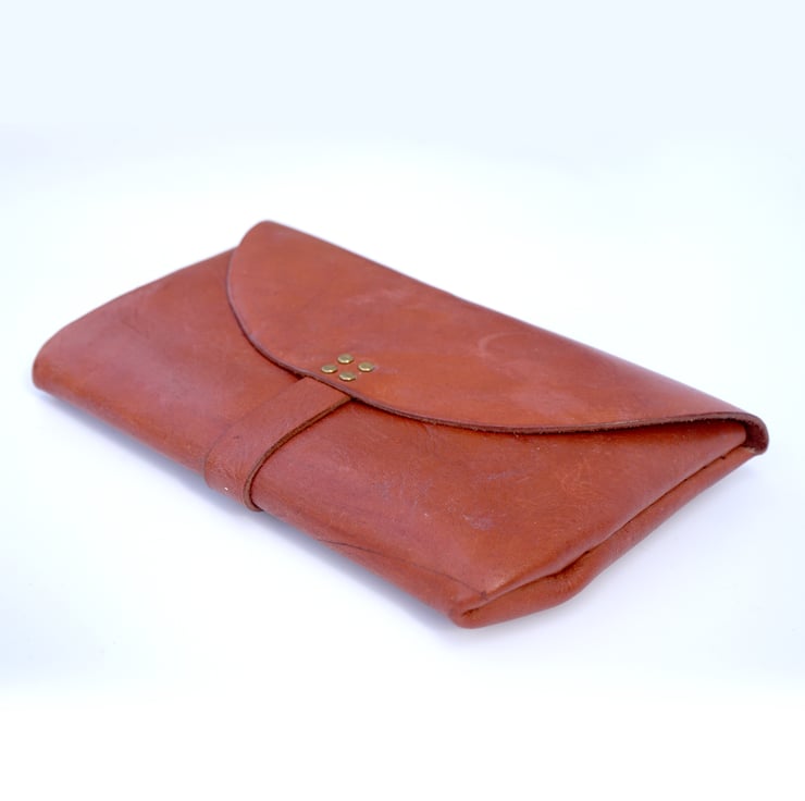 This slim and cute accessory is designed to keep your essentials organized while adding a touch of sophistication to your style. Crafted from vegetable tanned leather, this clutch boasts a rich reddish brown hue that exudes a warm, timeless appeal, seamlessly complementing any outfit. Its compact design ensures portability, making it an ideal companion for those on-the-go moments when all you need is your phone and wallet.