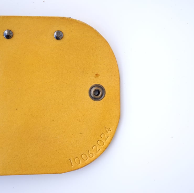 This handcrafted leather key holder delicately made, comes in a mustard colour with various patterns. Its production date is stamped on the back and it an securely hold up 6 keys with a sap button for closure.