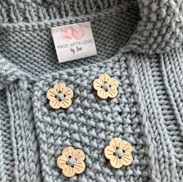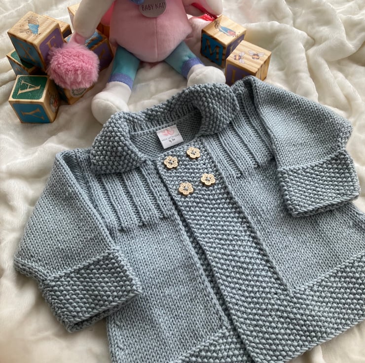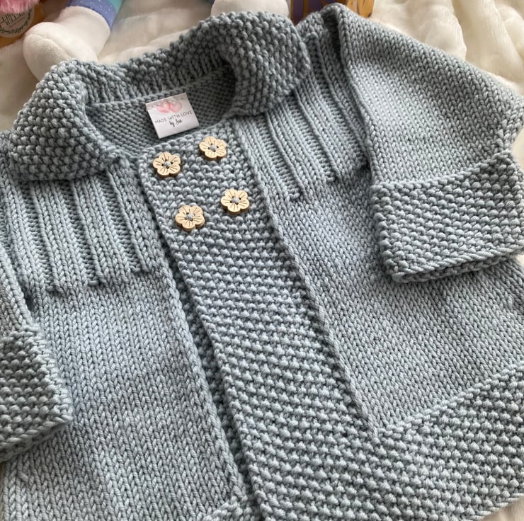 Hand knitted baby girl’s jacket. I have knitted this gorgeous little jacket using a duck egg blue coloured super fine pure merino wool, which is beautifully soft, warm and breathable for your precious little one. The jacket has been knitted using a number of different stitches to give detail and fluidity and is finished with a double-breasted front, fastened with flower shaped carved coconut shell buttons. I love the classic elegance of this little jacket - it looks so stylish!