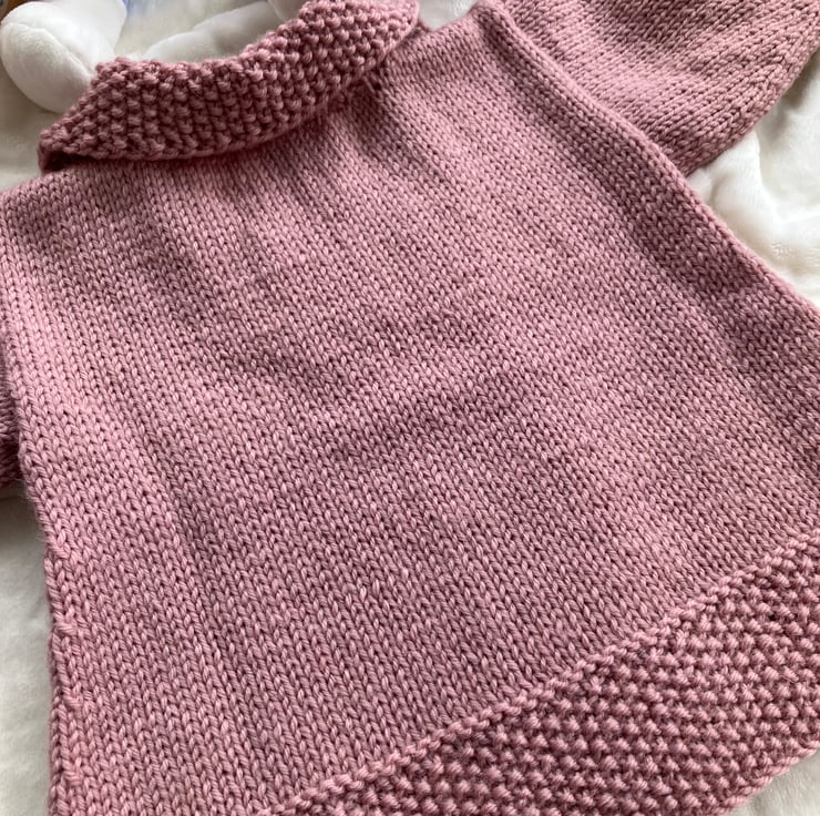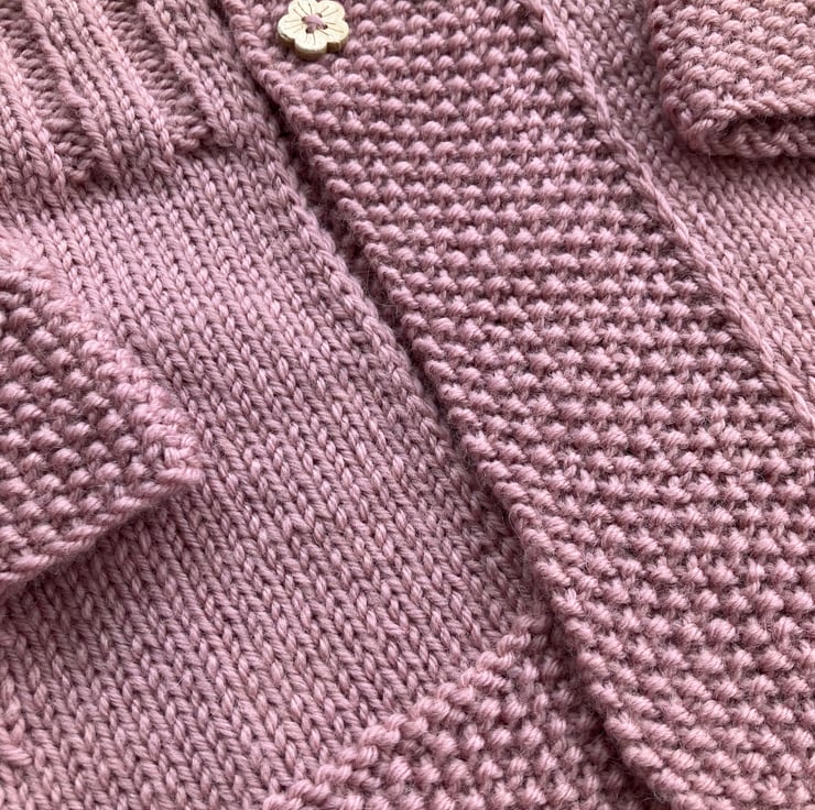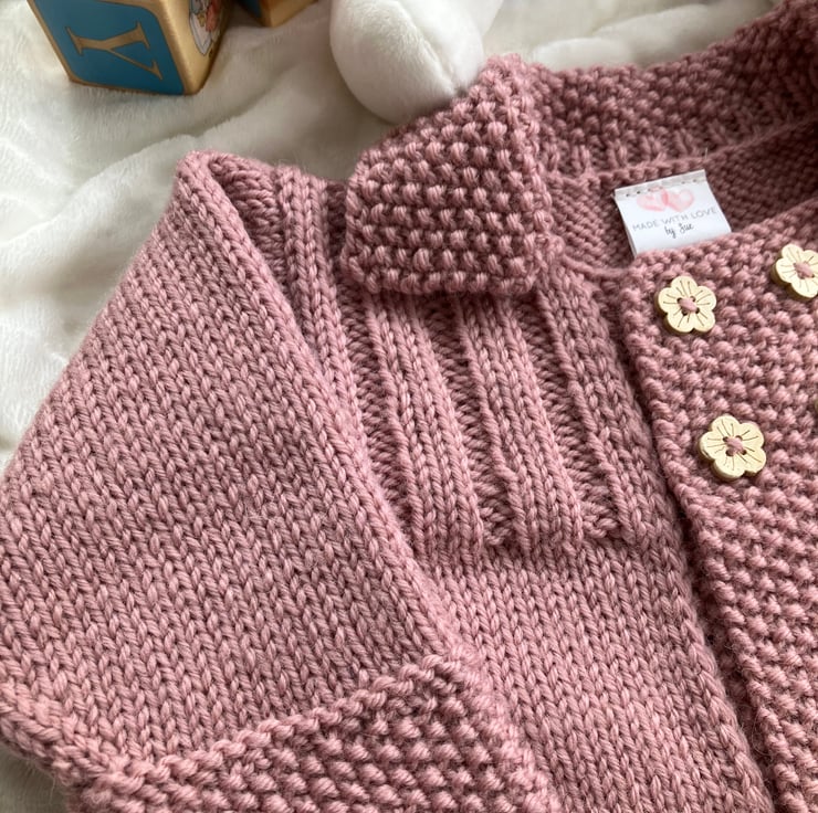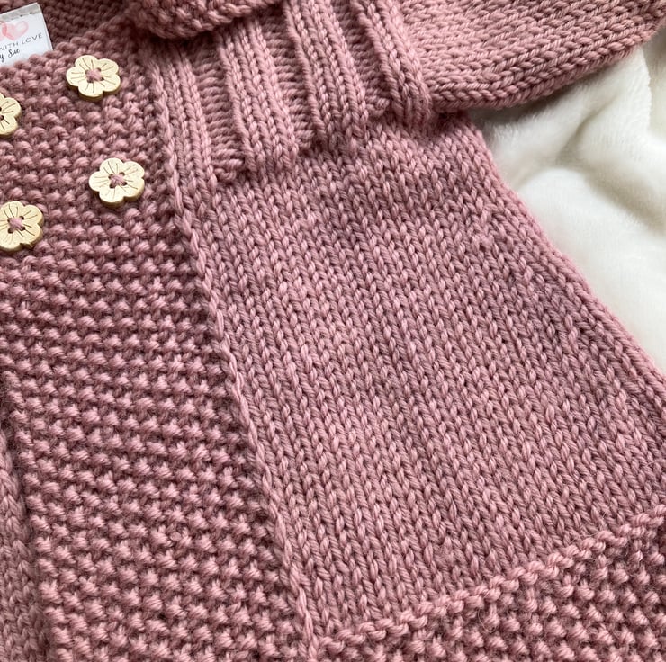 Hand knitted baby girl’s jacket. I have knitted this gorgeous little jacket using a dusky pink coloured merino blend wool, which is beautifully soft, warm and breathable for your precious little one. The jacket has been knitted using a number of different stitches to give detail and fluidity and is finished with a double-breasted front, fastened with flower shaped carved coconut shell buttons. I love the classic elegance of this little jacket - it looks so stylish!