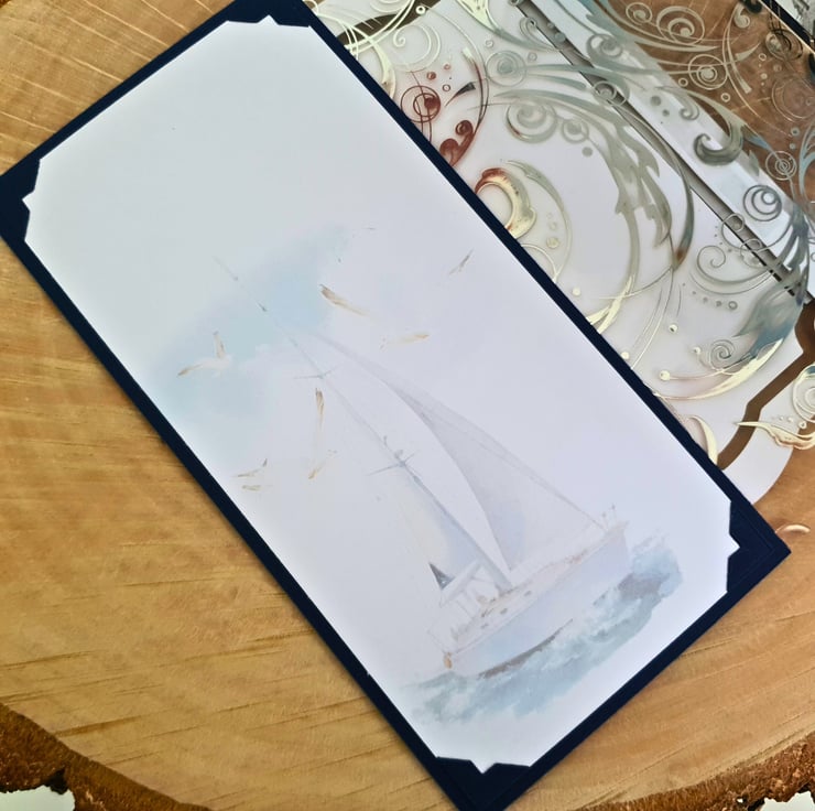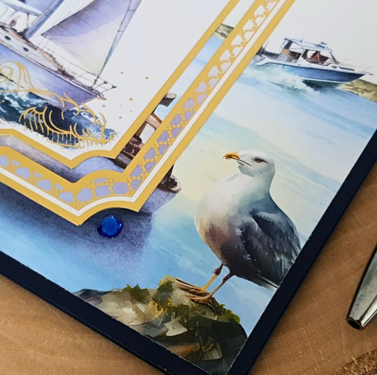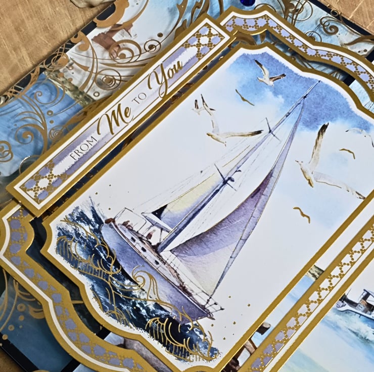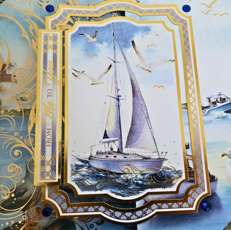 It consists of navy blue card base layered with cardstock printed with a sea landscape. The front panel is made of gold foiled acetate and a panel that matches the colour & design of the inside. On the inside & behind the panel, there is a matching insert, blank for your wishes & bordered with decorative photo corners. The main topper displaying a yacht surrounded by seagulls lays on the front of the card, along with the sentiment "From Me To You". The card is embellished with gemstones in blue.