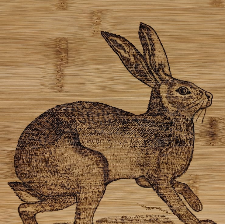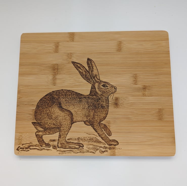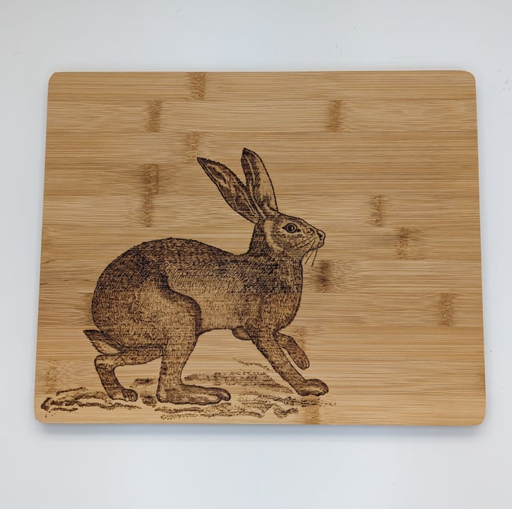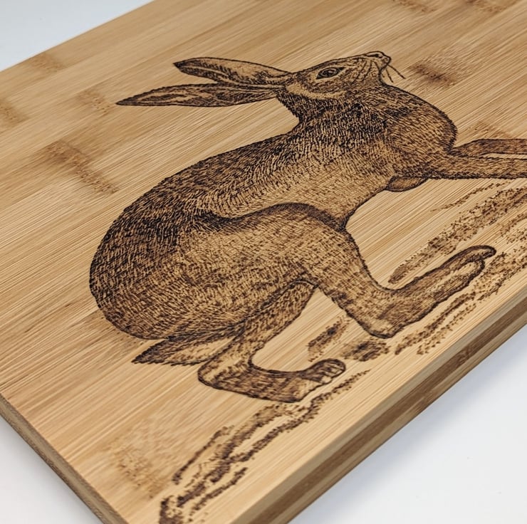 Lovely wooden chopping board or serving board made from bamboo which has been lovingly handburnt with a beautiful hare using the art of pyrography and finished with food grade wood oil. The board has been decorated on one side only so if being used for cutting or chopping the board can be flipped over to preserve the design.