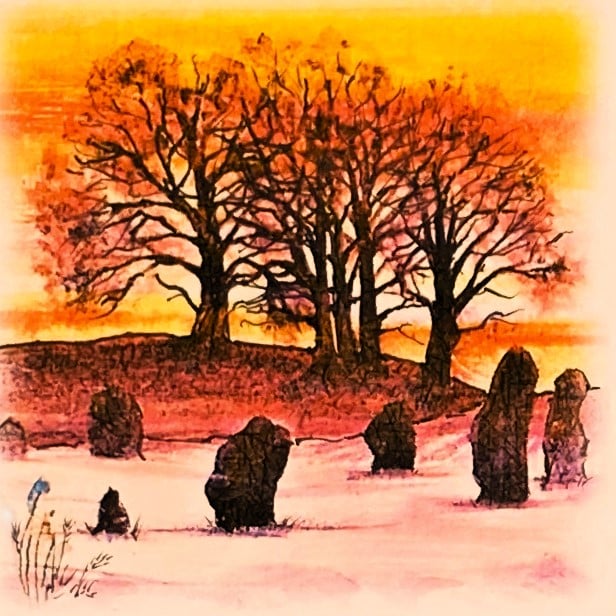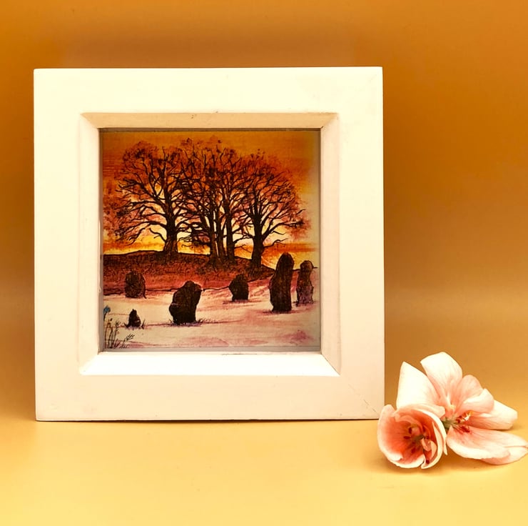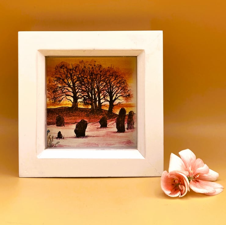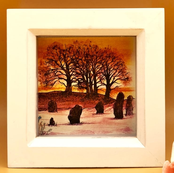 This tiny signed print of Avebury standing stones is presented in a white box frame and signed & dated by me. The colourful print is taken from my original larger painting and is augmented by extra hand drawn ink detail, making each one an attractive and unique 'one off'. The majestic standing stones of Avebury hold a special place in Britain's history - the print will appeal to anyone who loves our ancient past and to those interested in myth and pagan magic - it makes a lovely gift.