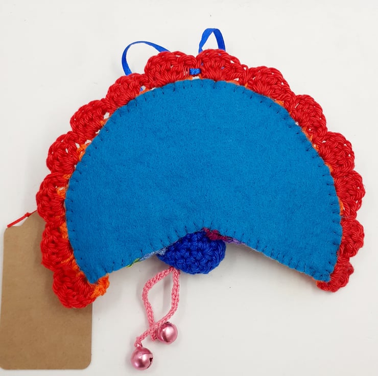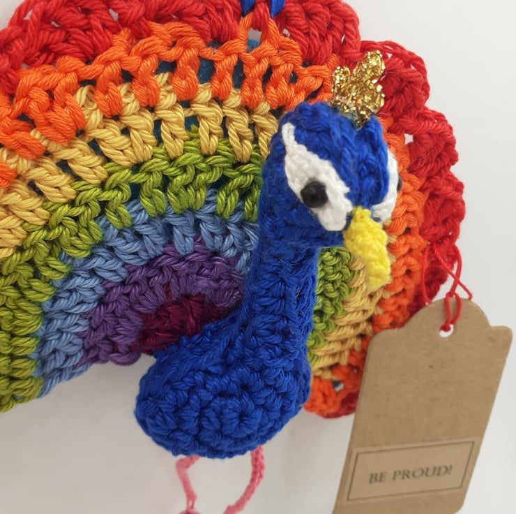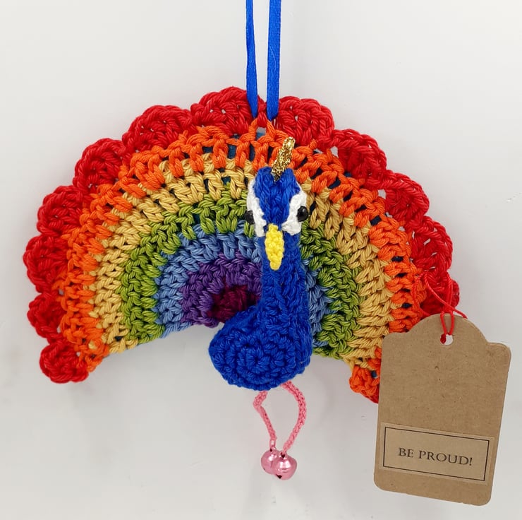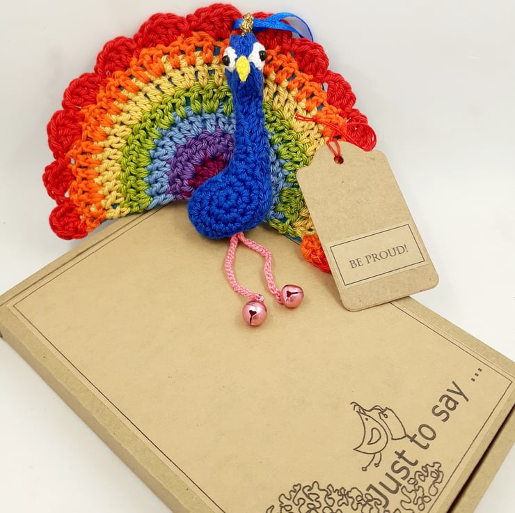 This fabulous, flamboyant creature is all set to carry a message on your behalf! It is crocheted in cotton in all the colours of the rainbow and its body is filled with polyester stuffing. The tail is backed with craft felt, its dangly legs finished with pink bells and it has beady black eyes! It hangs from a narrow ribbon loop. The peacock's tail span is approximately 15cm and it measures approximately 14cm from the top of its tail to its bell feet.