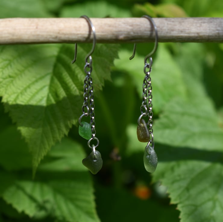 These earrings are made from 925 sterling silver, and sea glass collected locally in the Scottish Highlands. Each earring features two tiny pieces of sea glass in varying shades of green and amber, suspended from a length of sterling silver belcher chain, with handmade sterling silver hooks. The silver components have been finished with a patina using liver of sulphur. They measure just over 5cm from the top of the hook, and have a 'dangle length' (from the bottom of the hook) of around 3.5cm.