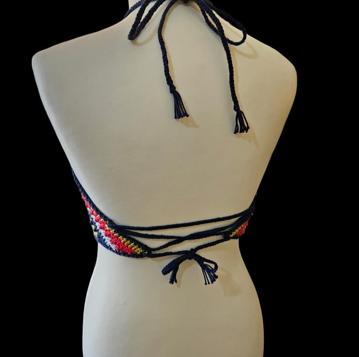 This stunning crop top is crafted from 100% cotton yarn, this is a small to medium size, featuring adjustable straps for a perfect fit. It's an ideal match for jeans, skirts, or shorts.