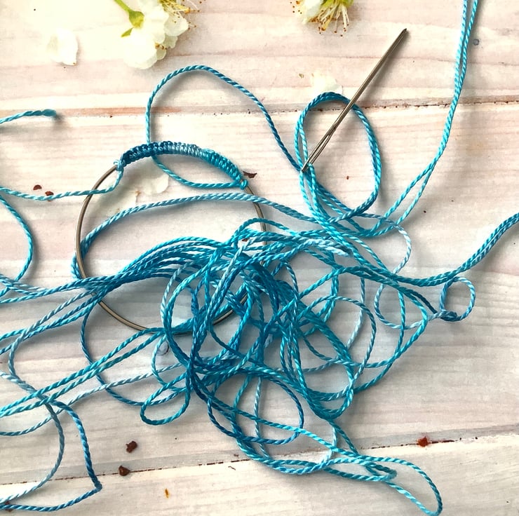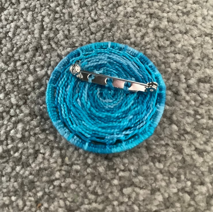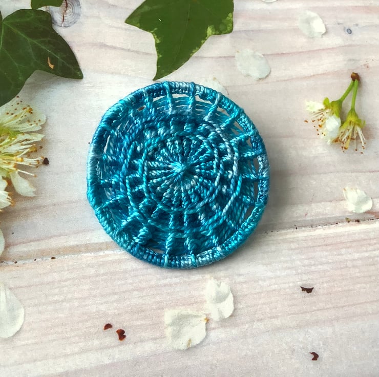I have made this gorgeous dorset button using a turquoise colour changing cotton thread on a thin 45mm white metal ring. There is a brooch bar with a security catch sewn firmly to the back.