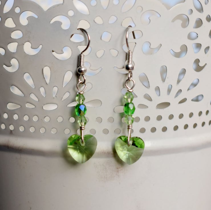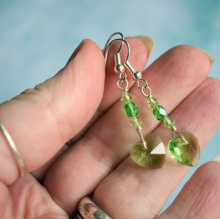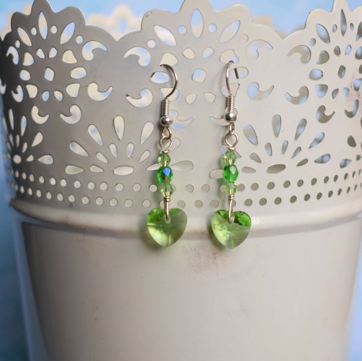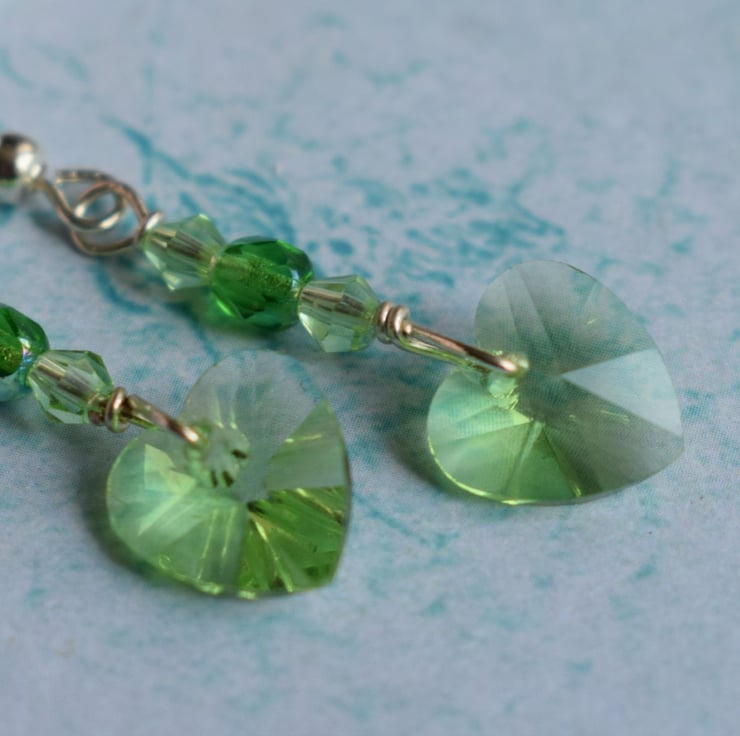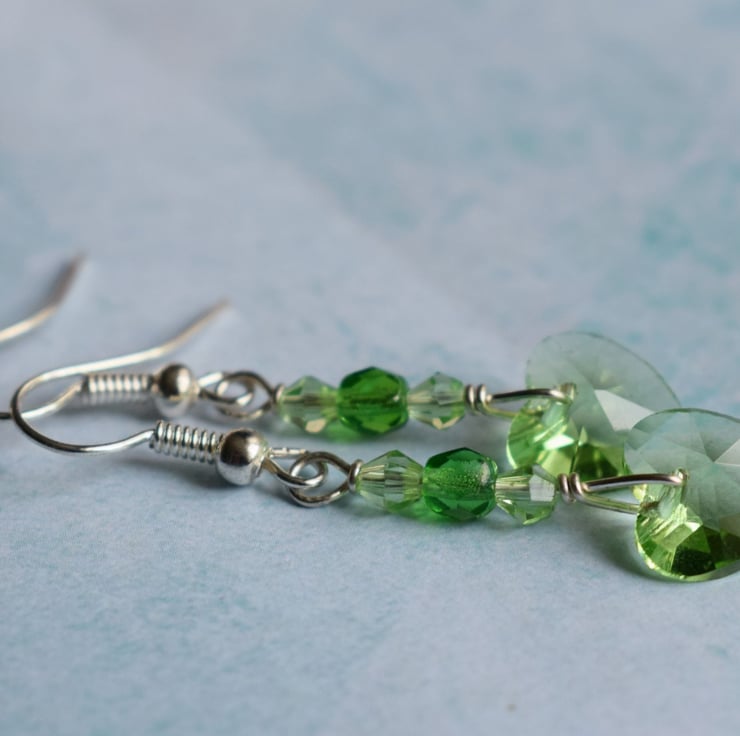 The pale green faceted glass hearts are only around 1 cm high and are hung below 3 tiny glass beads, a paler faceted bead top and bottom with a 4mm slightly darker green Czech glass bead in the middle. The earwires are silverplated but you can swap for hypoallergenic stainless steel earwires or silverplated clip ons if you would prefer. Just choose the option that best suits you from the drop down menu.