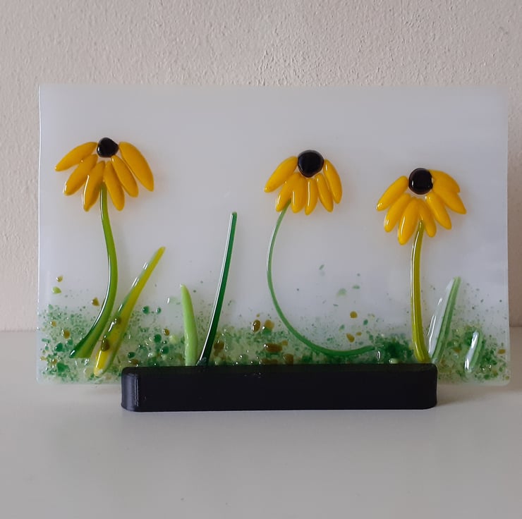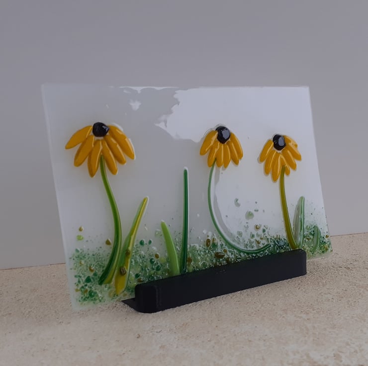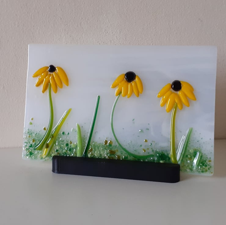 Bright and cheerful little fused glass panel of yellow daisies arranged on a background of clear and white streaky glass. The flower components are lightly fused onto the background glass to give a 3D finish. The panel is supplied with its own black plastic stand. Looks at its best displayed on a windowsill where the light can catch it.