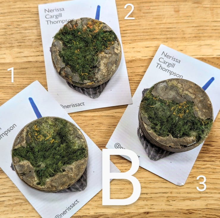 To limit my waste, I turn my colourful textile offcuts into jewellery. I combine the embellished textiles with leftover concrete when casting sculptures. Just like my sculptures, they are cast in plastic food packaging giving the resulting brooches a bold contrast of textures. These brooches are 50mm across and taper slightly to the front. Each unique brooch has a standard safety clasp back attached using epoxy resin.