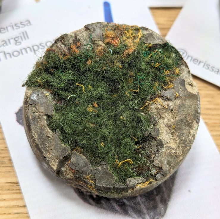 I create coastal inspired textures using a combination of embellishing and embroidery; blending a variety of recycled fabrics to create subtle variations in tone. These are stitched inside waste plastic to cast true to life pieces with cement giving a distinct contrast between the manmade structure of the packaging and the soft natural textures of the textiles.