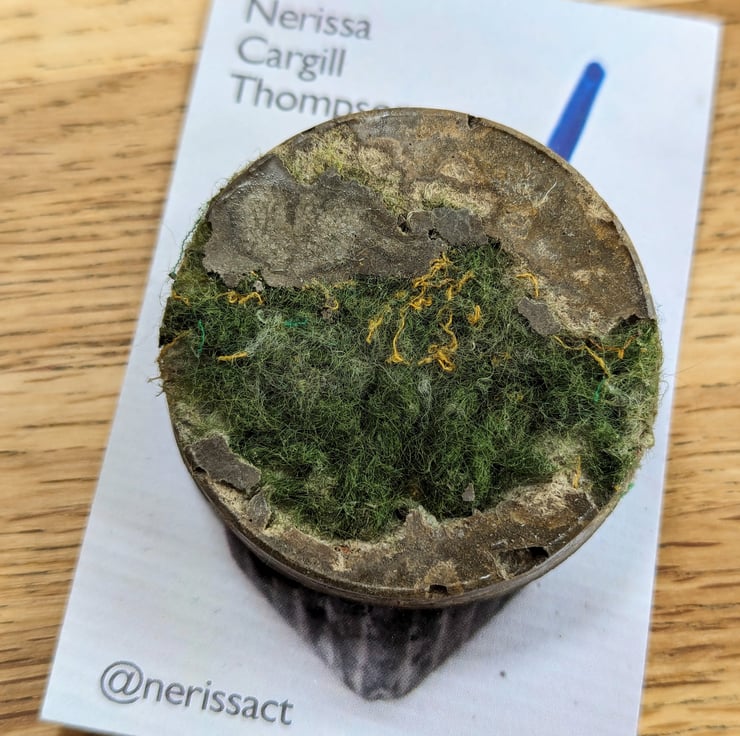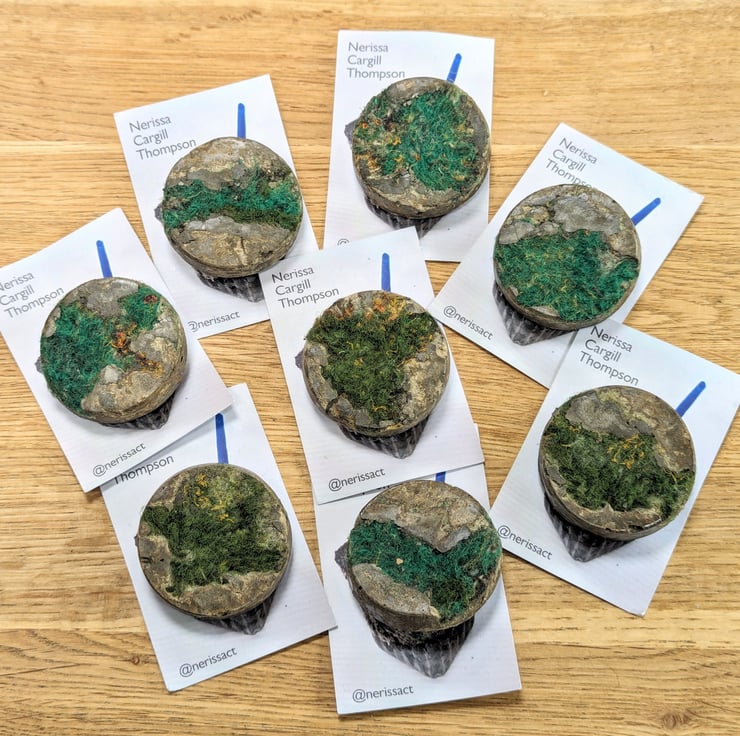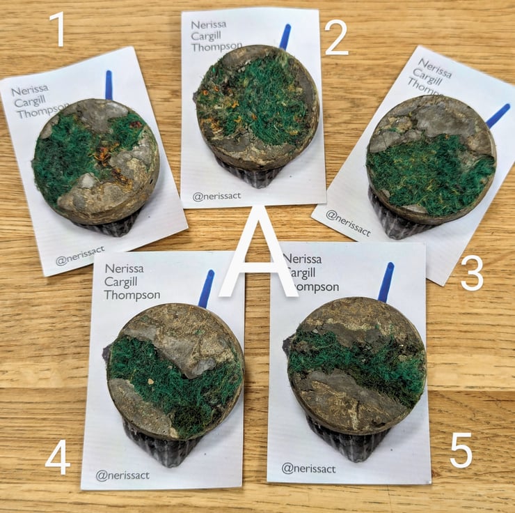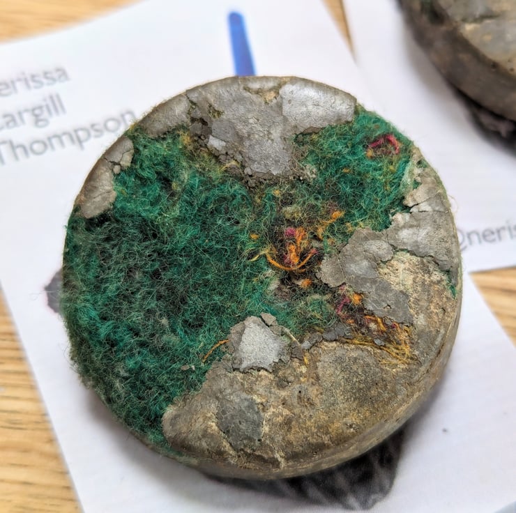 To limit my waste, I turn my colourful textile offcuts into jewellery. I combine the embellished textiles with leftover concrete when casting sculptures. Just like my sculptures, they are cast in plastic food packaging giving the resulting brooches a bold contrast of textures. These brooches are 50mm across and taper slightly to the front. Each unique brooch has a standard safety clasp back attached using epoxy resin.