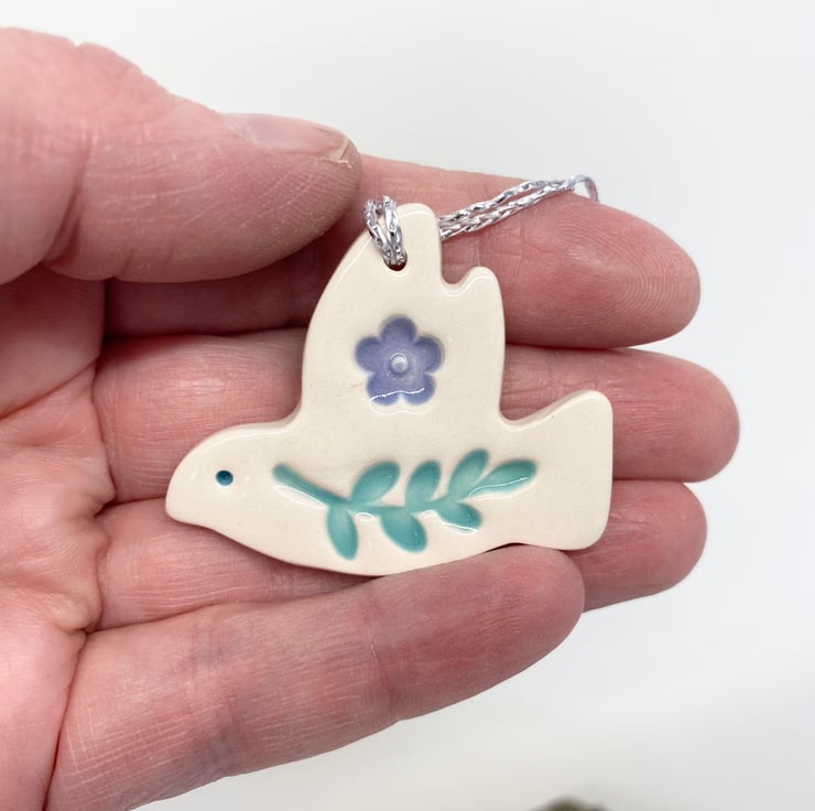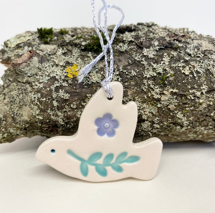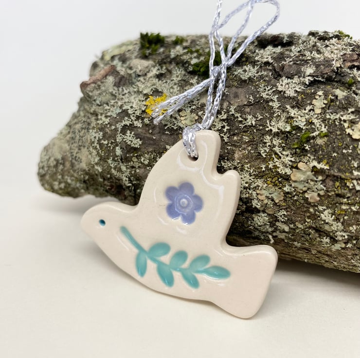 This little ceramic dove decoration is made from white earthenware clay and finished with leaves and a flower This has been fired in an electric pottery kiln, so it is nice and strong. It measures 4.5cm x 4cm and hangs from a silver string. It is glazed on the front and left plain on the back.