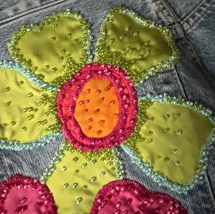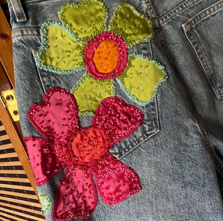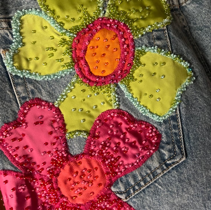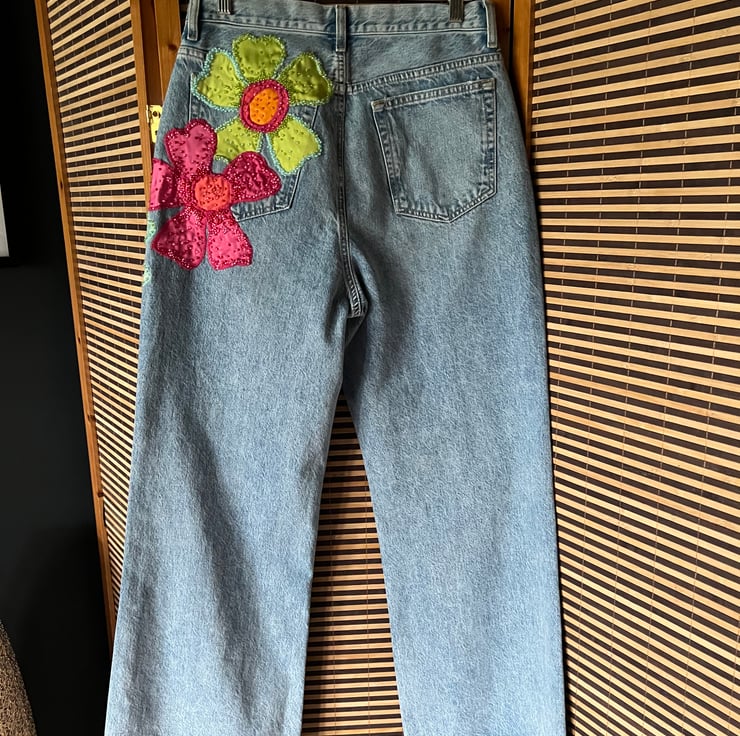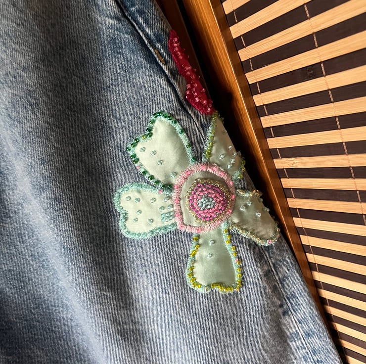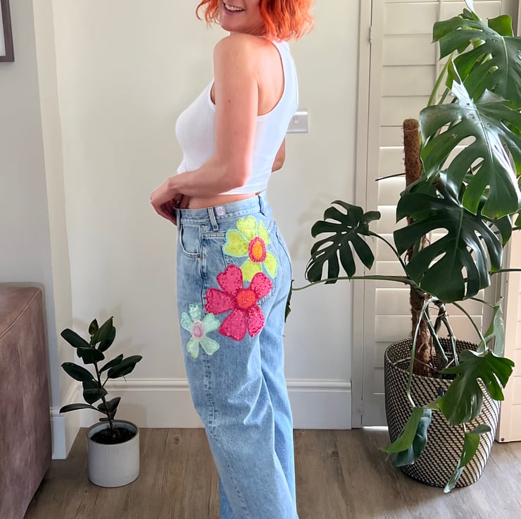 Meet the perfect addition to your casual wardrobe – our cherry blossom inspired wide leg jeans. These beautiful jeans features appliqued cherry blossoms finished with hand beading. We offer FREE UK standard shipping.