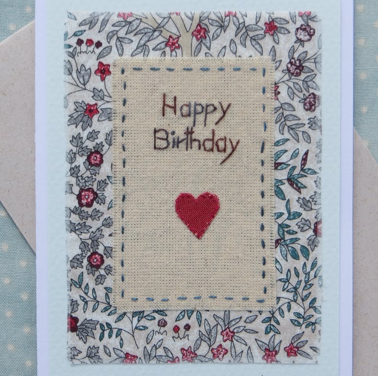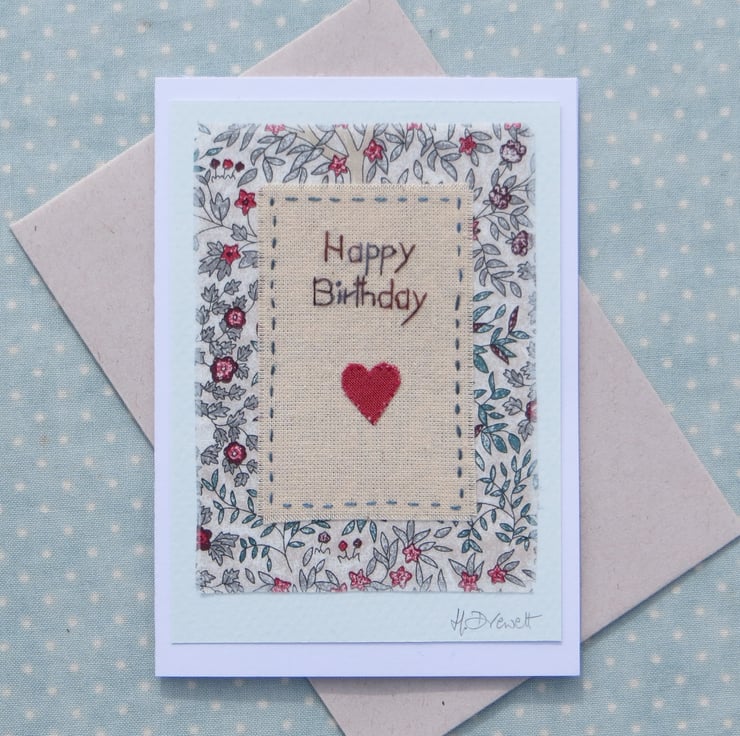 For this card I have embroidered the words 'Happy Birthday' and then stitched the embroidered panel to a lovely piece of Liberty Tana Lawn cotton print fabric for the background. I added a little applique heart to complete the design.