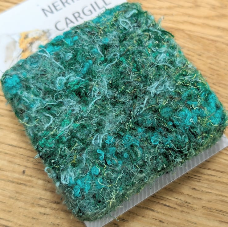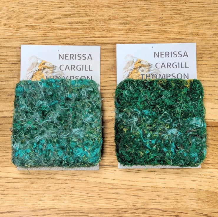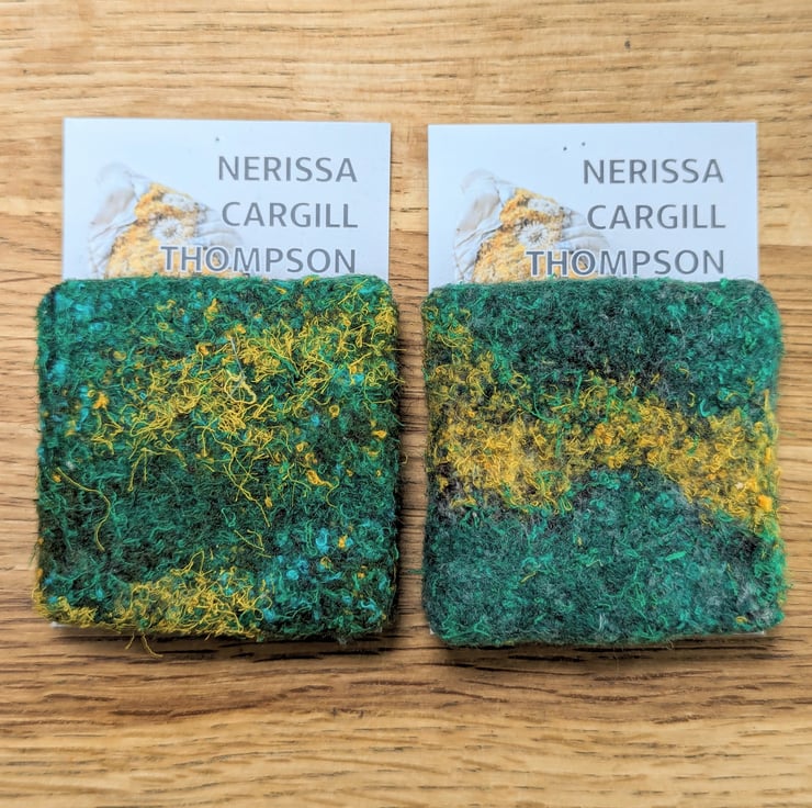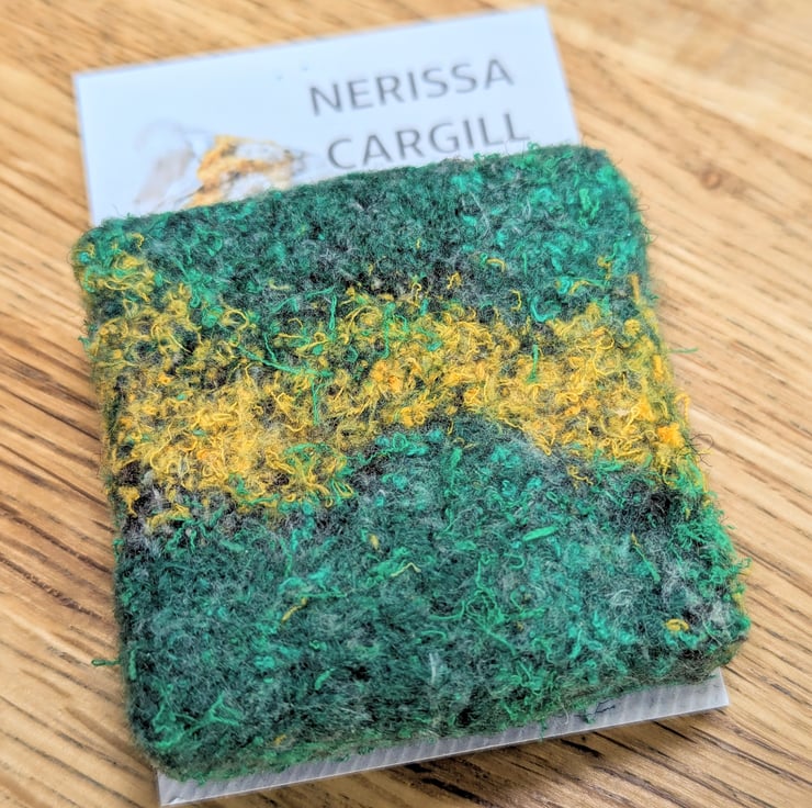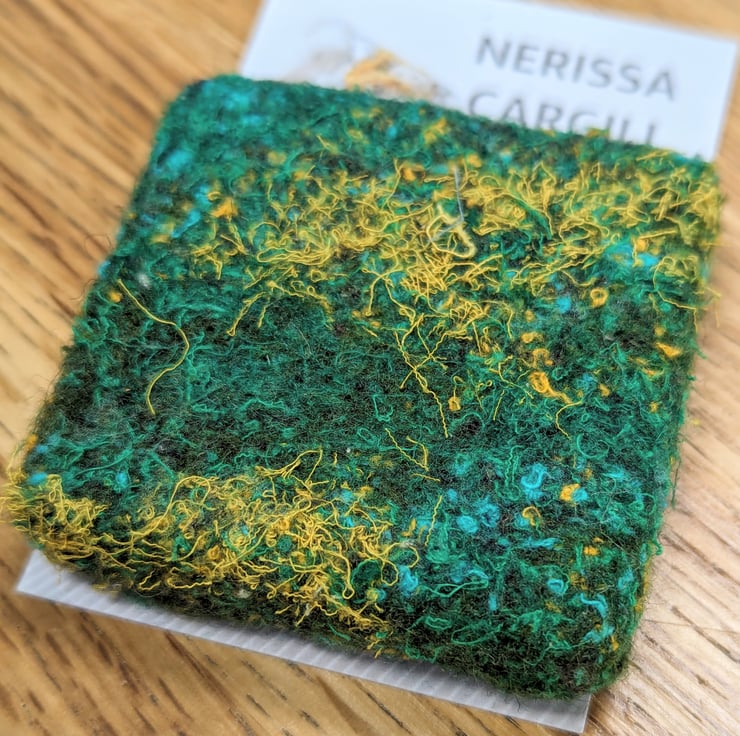 Unique piece of textile art. Embellished and embroidered recycled fabric inspired by coastal textures in a soft muted palette of mossy greens with pops of yellow and turquoise.