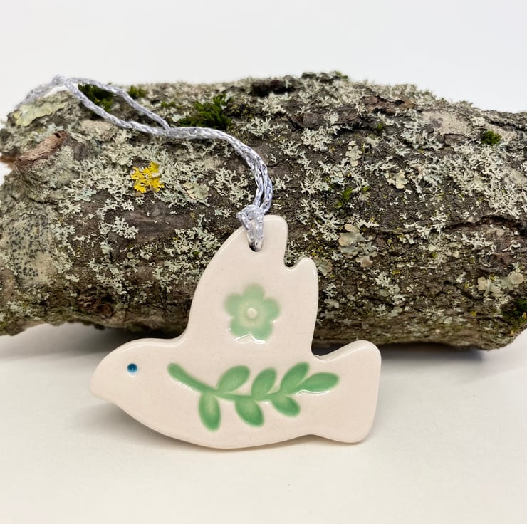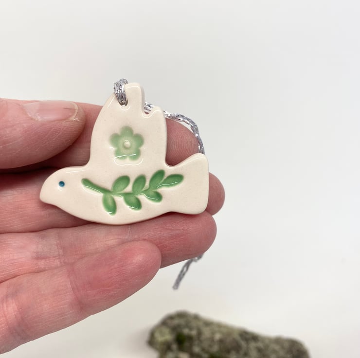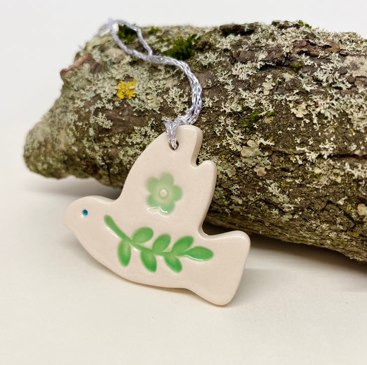 This little ceramic dove decoration is made from white earthenware clay and decorated with leaves and flower print. This has been fired in an electric pottery kiln, so it is nice and strong. It measures 4.5cm x 4cm and hangs from a silver string. It is glazed on the front and left plain on the back.
