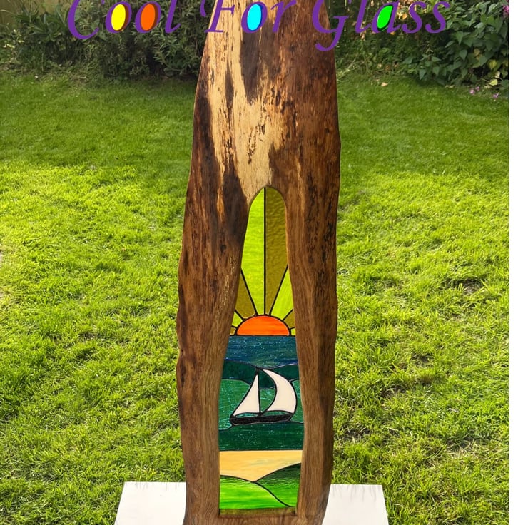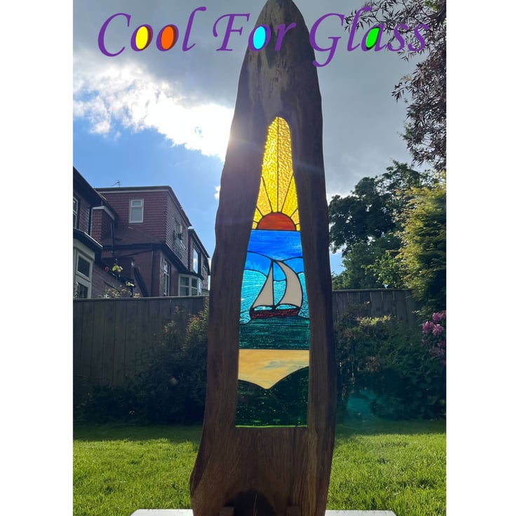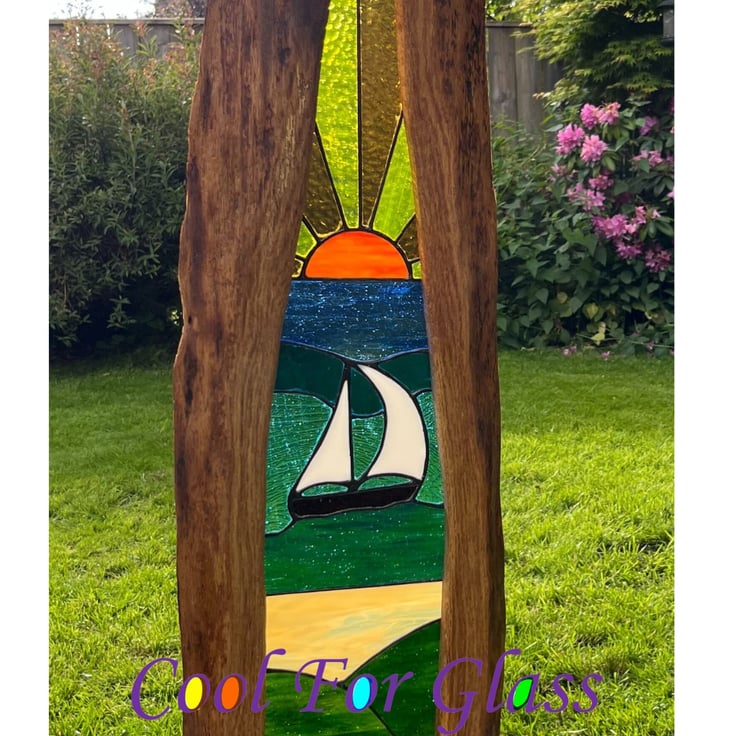 This piece gets noticed with such a stunning piece of stained glass depicting a yacht on a calm sea at sunset. Textured glass used around the yacht really makes it shimmer under the setting sun.