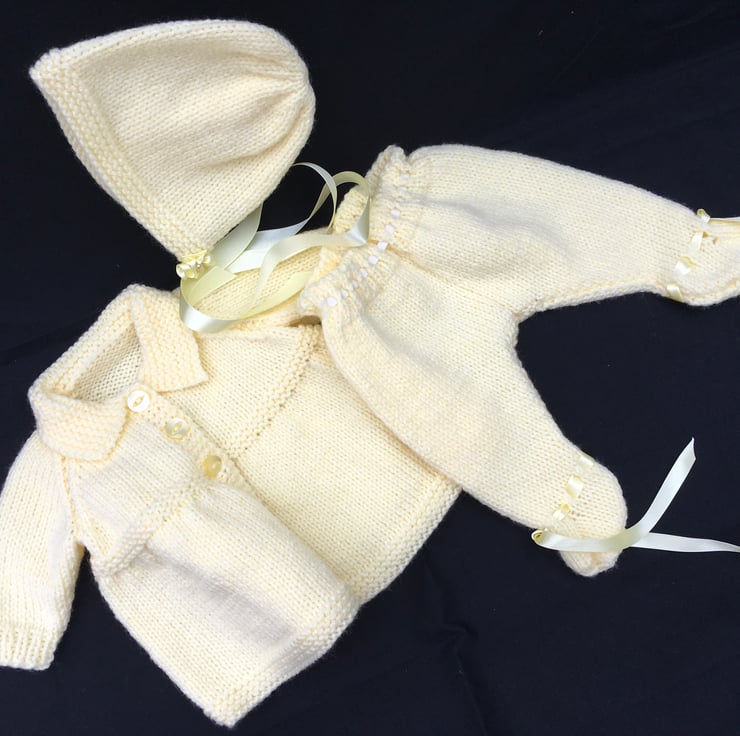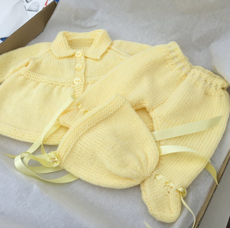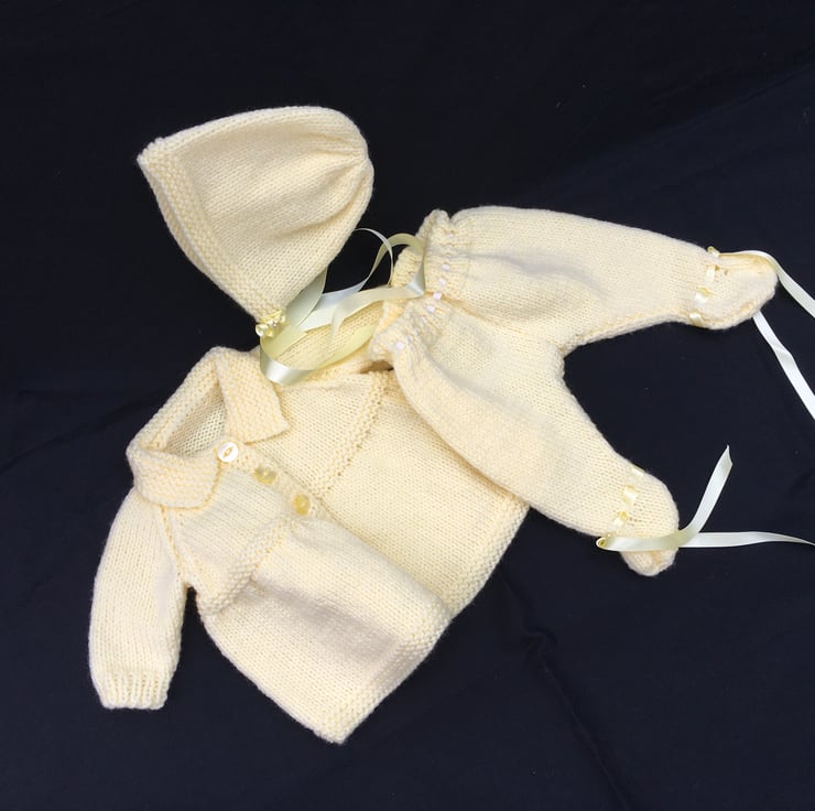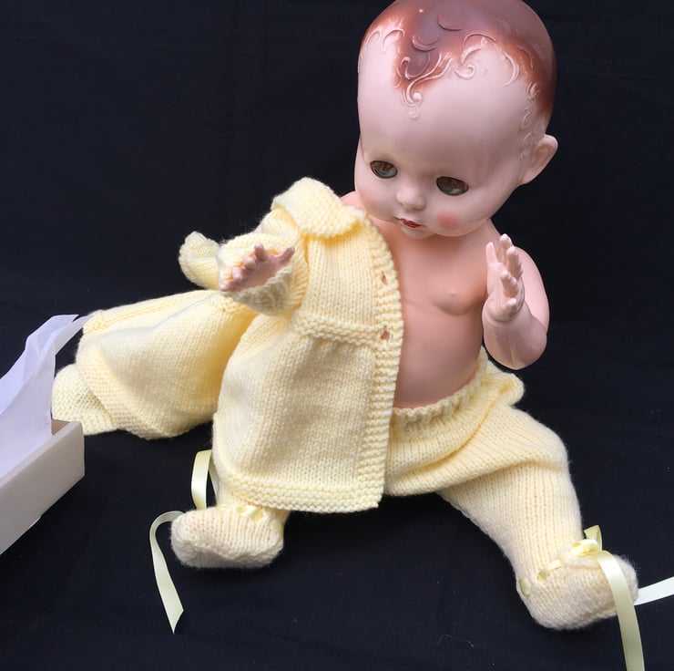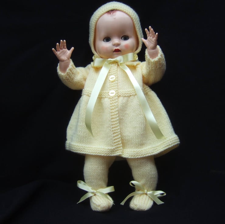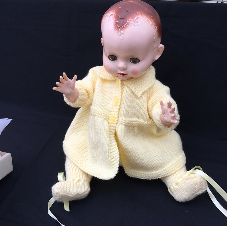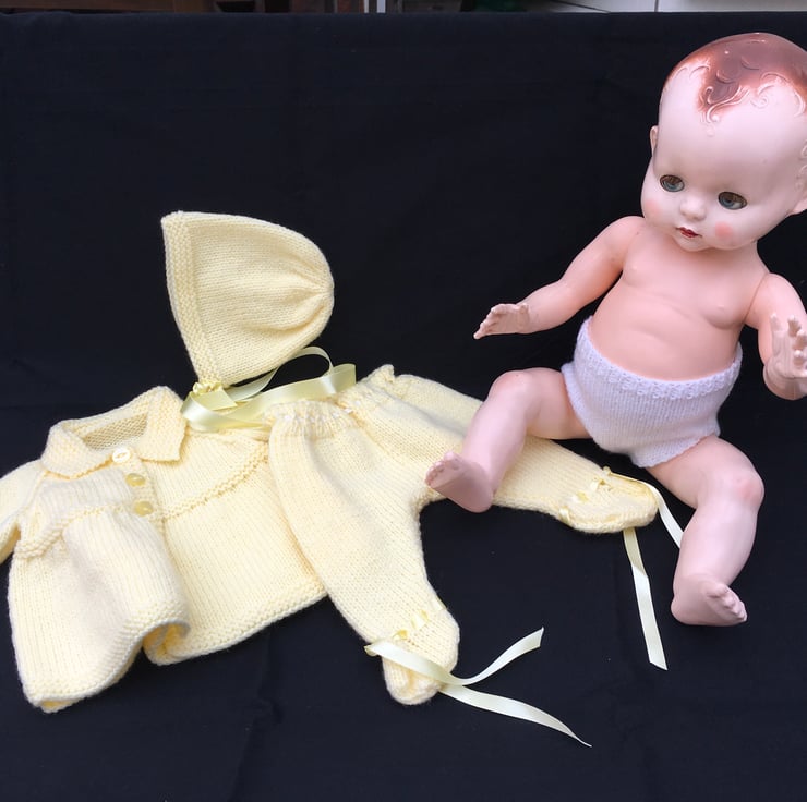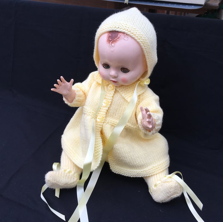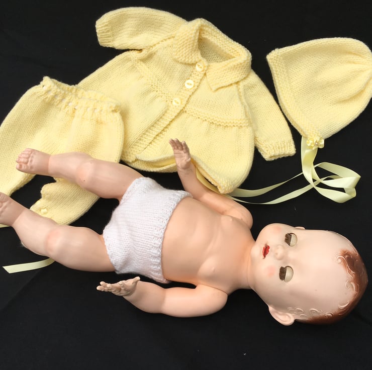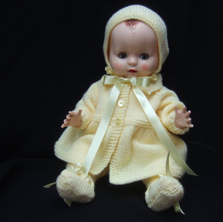 I knitted this 3 piece Pram Set from a vintage pattern my sister in law used to dress my dolls when I was a child, in the fifties. This particular set fits an 18” tall, bent-legged Pedigree hard plastic doll, with a 13 1/2” - 14” tummy and a 15-16” head circumference.
