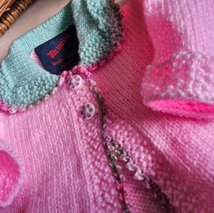 This delightful baby girl's set has been hand crafted in Cornwall using quality British manufactured machine washable yarns set at low temperatures. On the cardigan, dress and booties is a delicate hand crotcheted picot edging adding a feminine finish. The buttons are made from genuine wood with a delicate floral design on them.