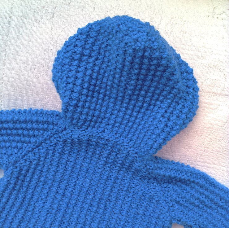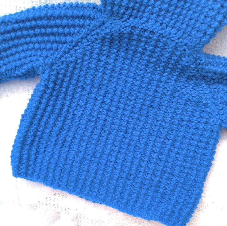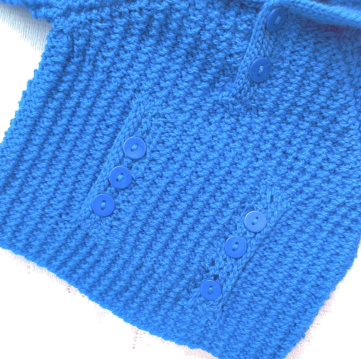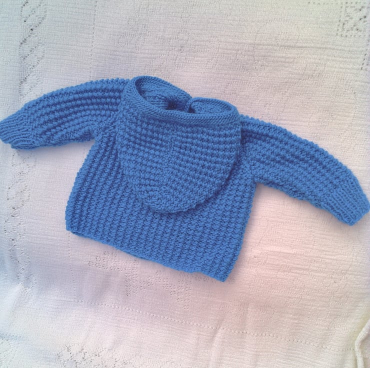 It is made using double knitting yarn in the blue colour shown and it is in stock in a size to fit a 0 - 6 month old baby with a 16/18 inch chest. It can also be made for you in a size and colour of your choice. Please see below for the available sizes and the corresponding prices and state the colour required when you order, most colours are available. Please allow approximately 2 weeks processing time for the jumper to be made and posted to you.