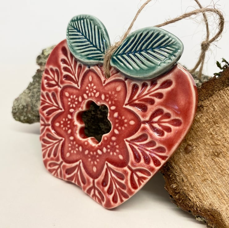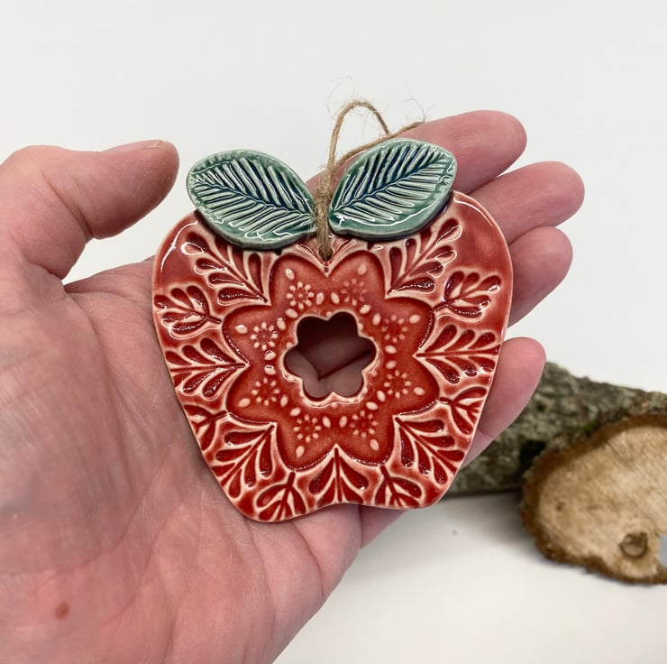 This cute little apple is hand cut from white earthenware clay and decorated with pattern. It has been fired once, a rich glossy glaze is applied and it is then fired again - so is nice and strong. It measures 7.5cm x 7cm and hangs from a brown string. It is glazed on the front and left plain on the back.