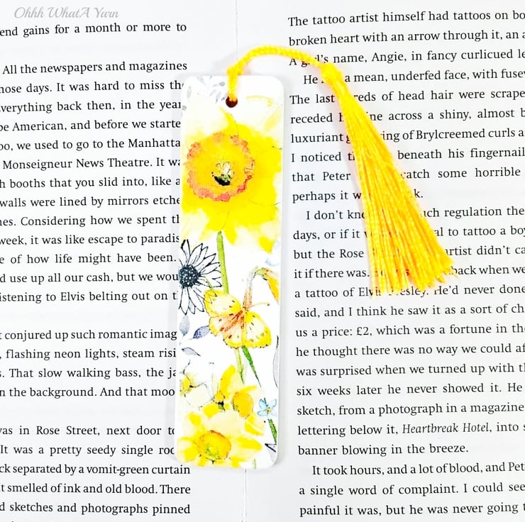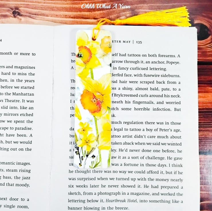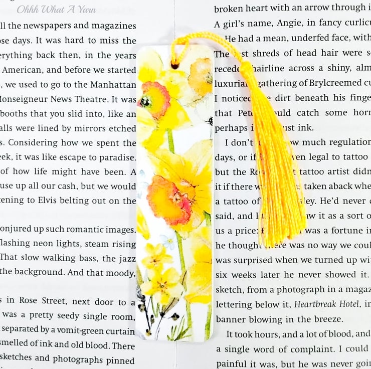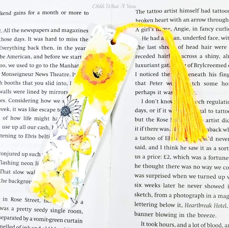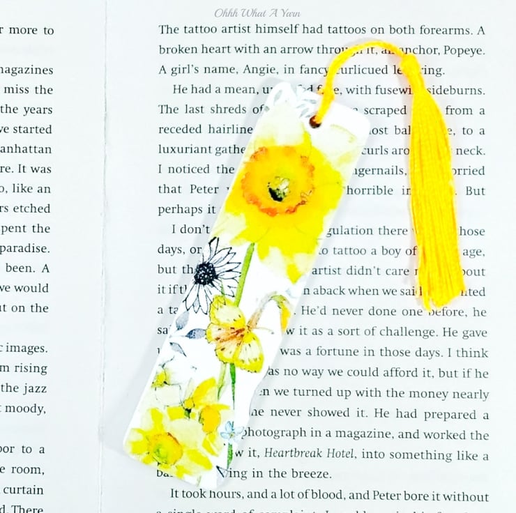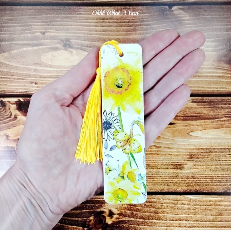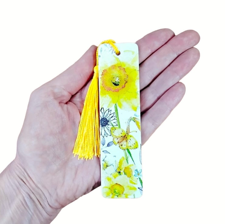 This pretty daffodil bookmark has been created using copyright free paper napkins on a wooden bookmark. It measures approximately 12cm by 3 cm. It is decorated on both sides with different daffodil images.