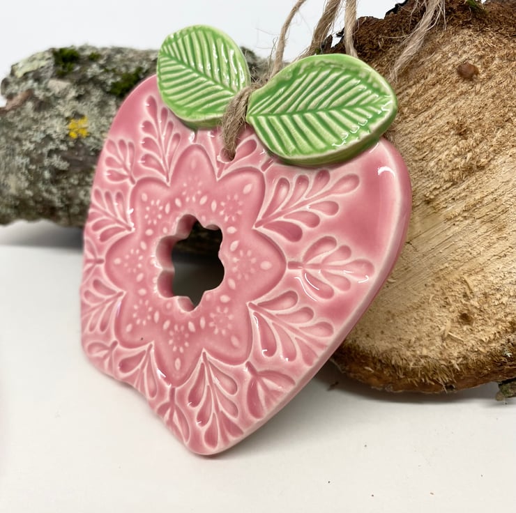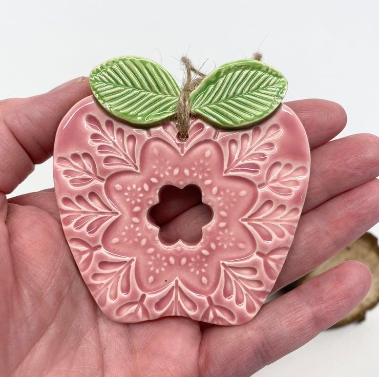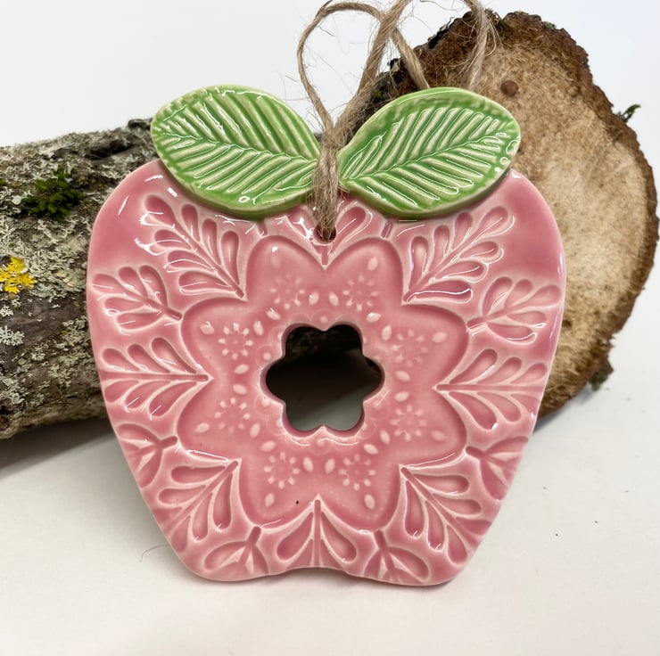 This cute little apple is hand cut from white earthenware clay and decorated with pattern. It has been fired once, a rich glossy glaze is applied and it is then fired again - so is nice and strong. It measures 7.5cm x 7cm and hangs from a brown string. It is glazed on the front and left plain on the back.