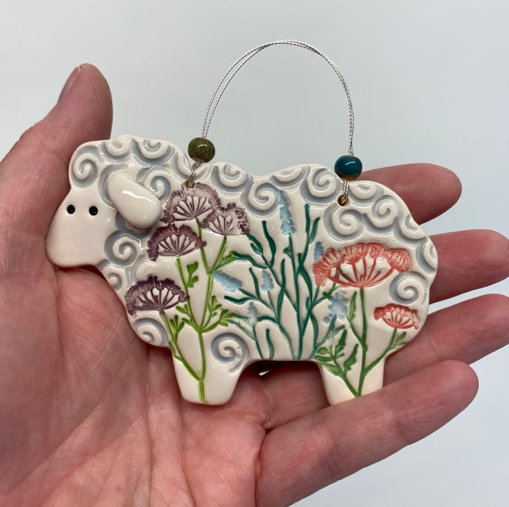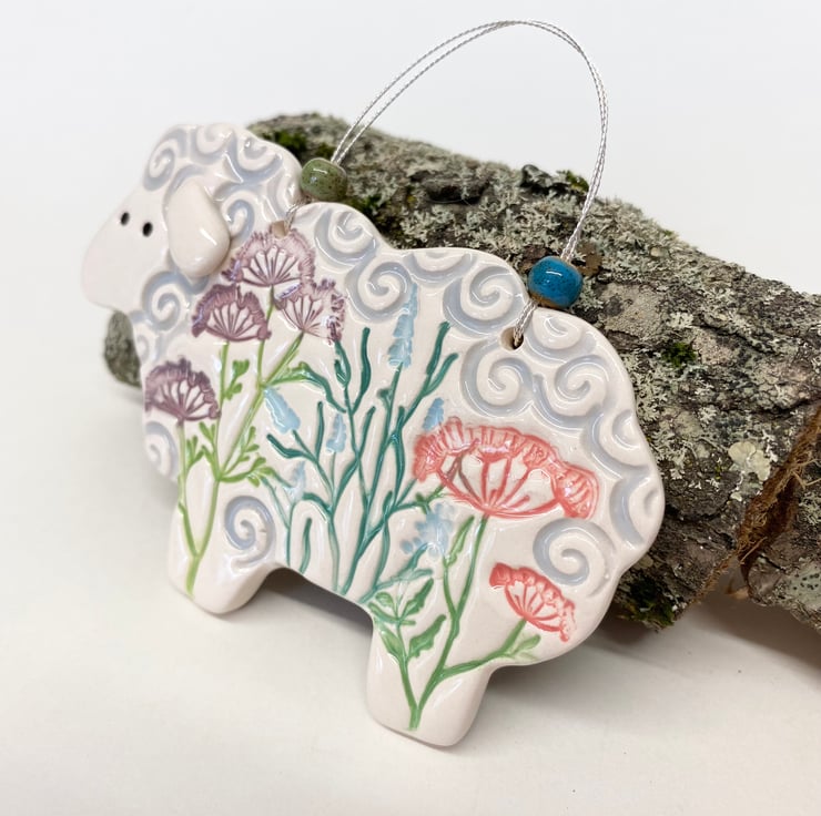 This ceramic sheep hanging decoration has been made from white earthenware clay, imprinted with pattern and underglazed with colour. It has then been fired in an electric kiln and glazed with a clear glossy glaze. If you love sheep or even pottery sheep, this is the decoration for you!