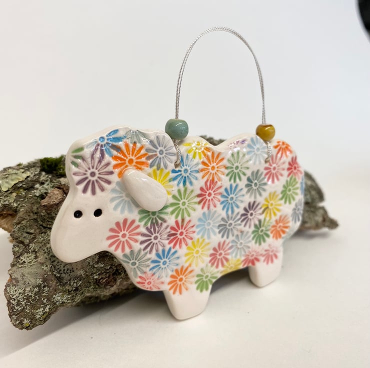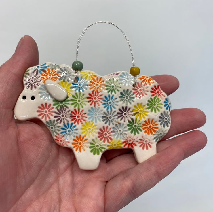This ceramic sheep hanging decoration has been made from white earthenware clay, imprinted with pattern and underglazed with colour. It has then been fired in an electric kiln and glazed with a clear glossy glaze. If you love sheep or even pottery sheep, this is the decoration for you!