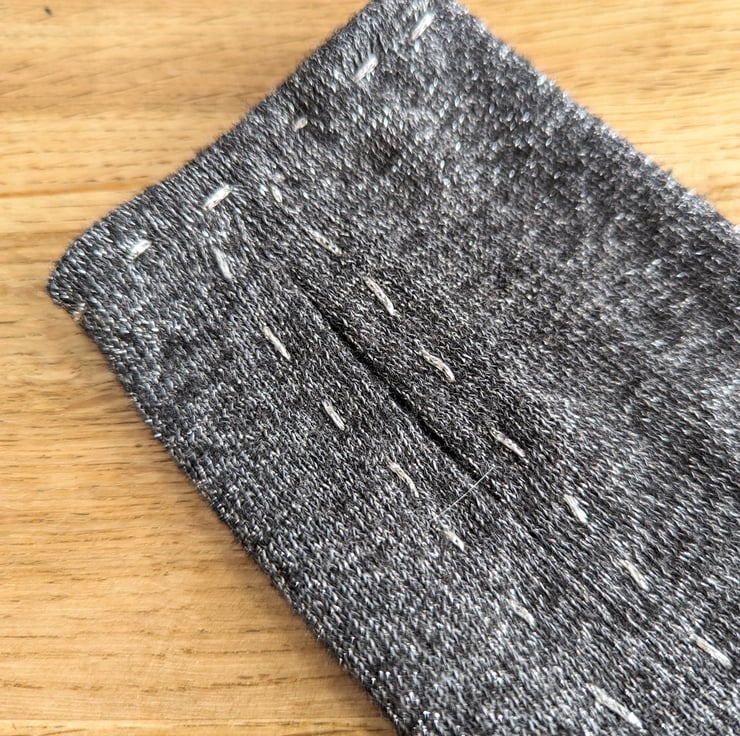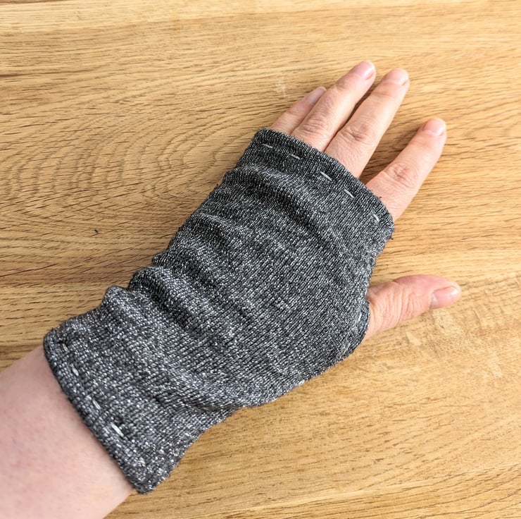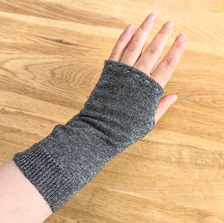 Wrist warmers are great both indoors and out; keeping warm while working from home but still able to type/write/sew or out shopping but no need to remove to keep removing. Finished with hand stitch detail.