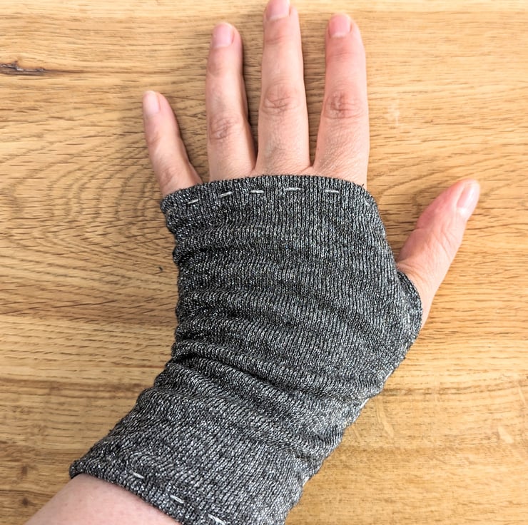 Dark silver wrist-warmers with silver stitch detail. Lightweight and sparkly, perfect for outdoor gigs and festivals.