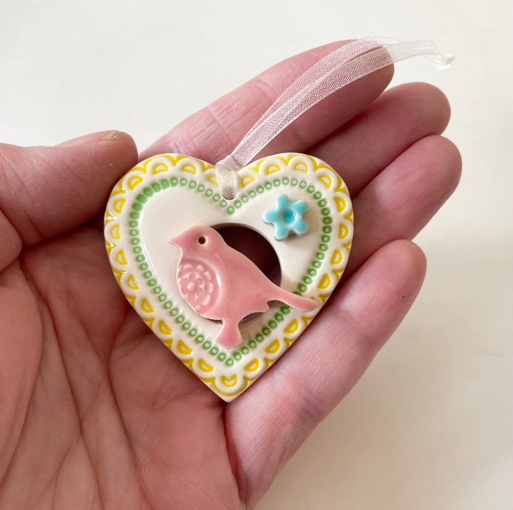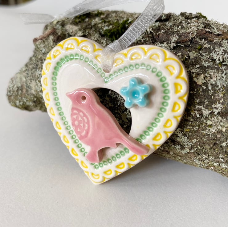 This little heart decoration is made from white earthenware clay and finshed with a little pottery bird. It has been fired twice and finished with a glossy glaze for a lovely smooth finish. It measures 4.5 x 5cm x 1cm deep and hangs from an organza ribbon