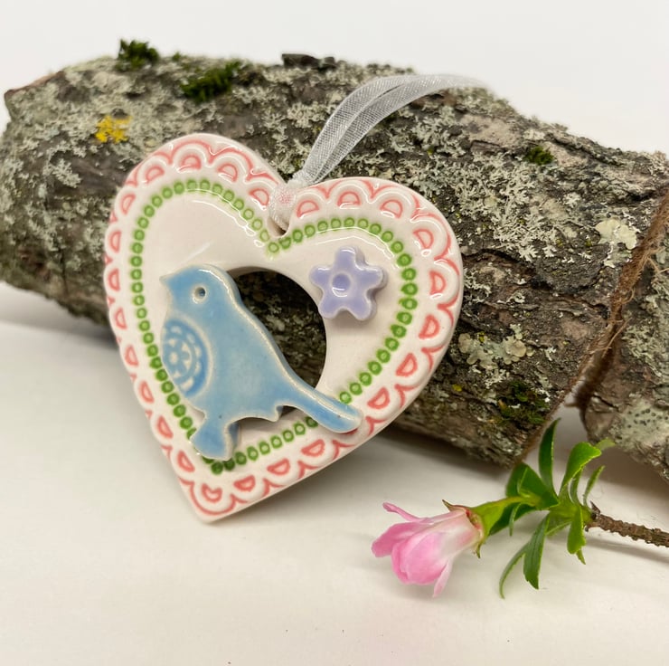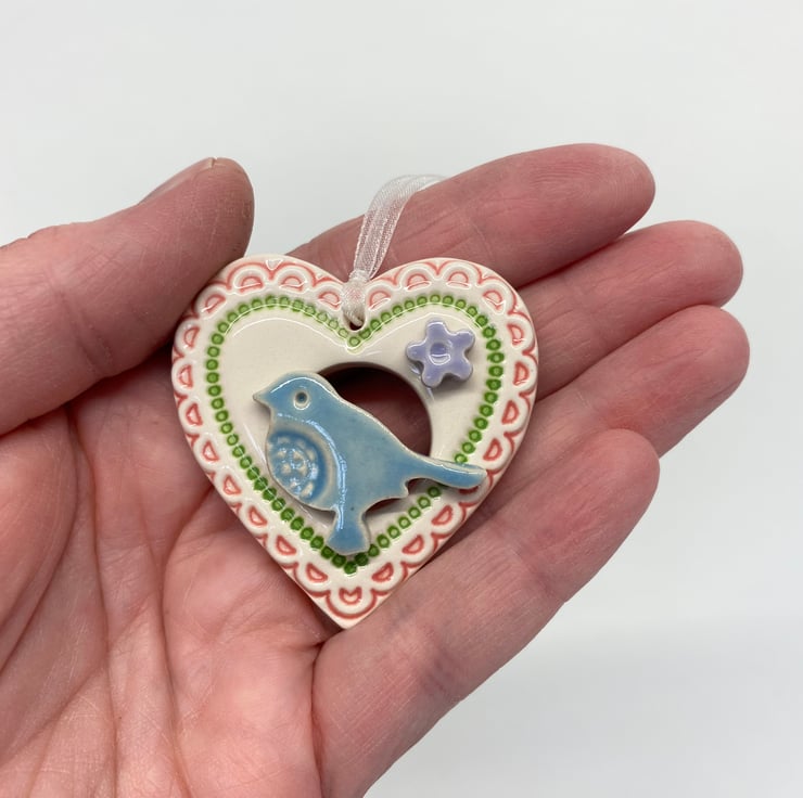 This little heart decoration is made from white earthenware clay and finshed with a little pottery bird. It has been fired twice and finished with a glossy glaze for a lovely smooth finish. It measures 4.5 x 5cm x 1cm deep and hangs from an organza ribbon