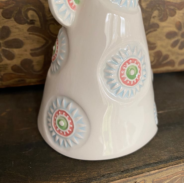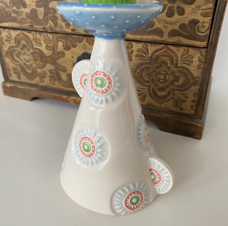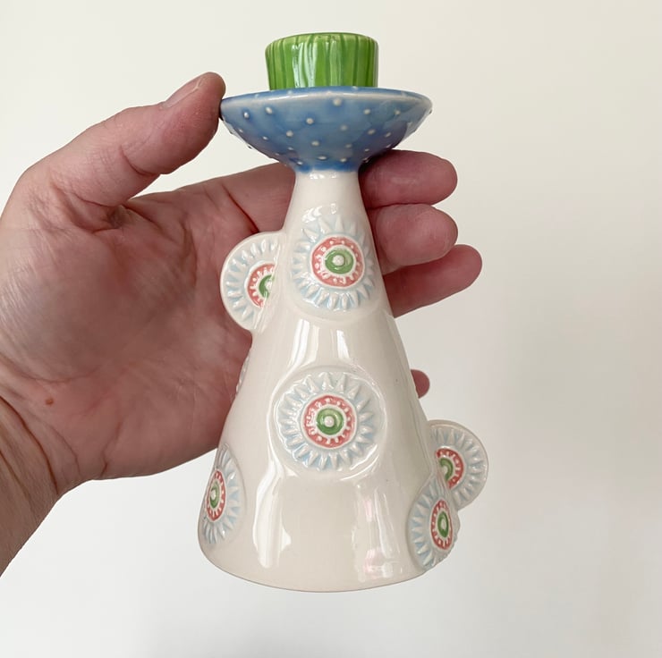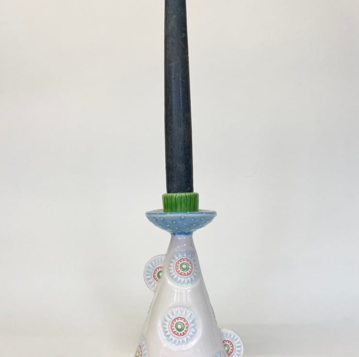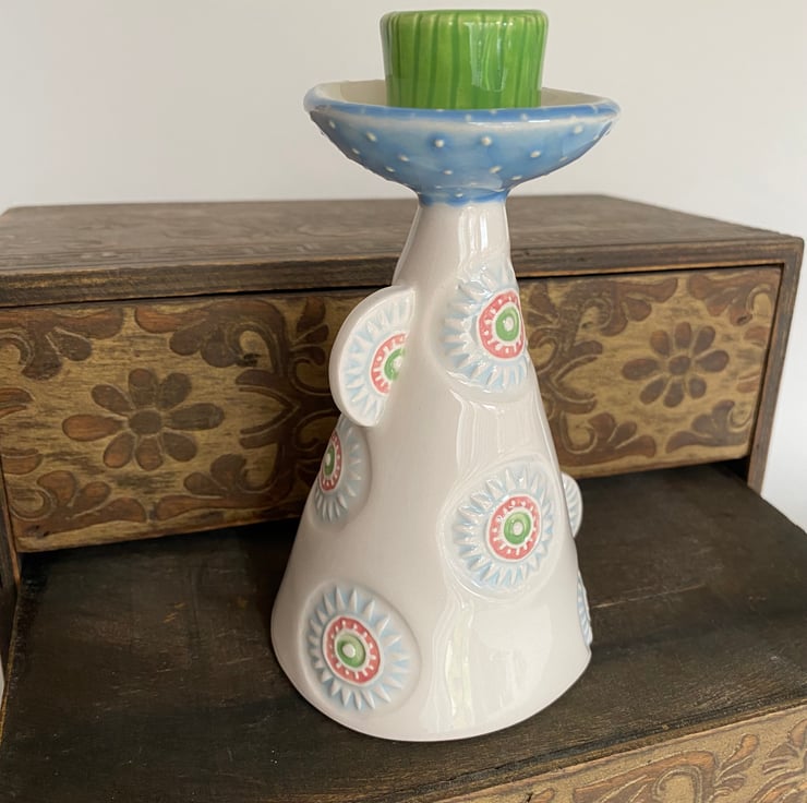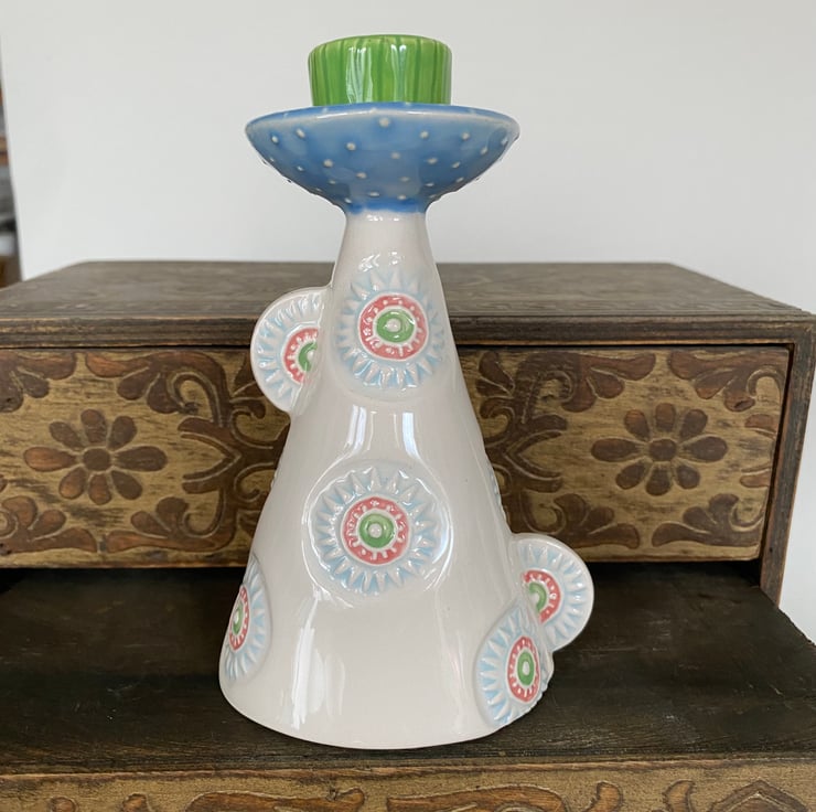 Illuminate your space with this unique handcrafted ceramic candle holder. Featuring a whimsical conical shape adorned with colourful, intricate patterns, this piece combines functionality with artistic charm. The base is decorated with circular motifs in pastel blues, greens, and pinks, adding a playful yet elegant touch. Topped with a vibrant green and blue accent, this candle holder stands out as a statement piece.