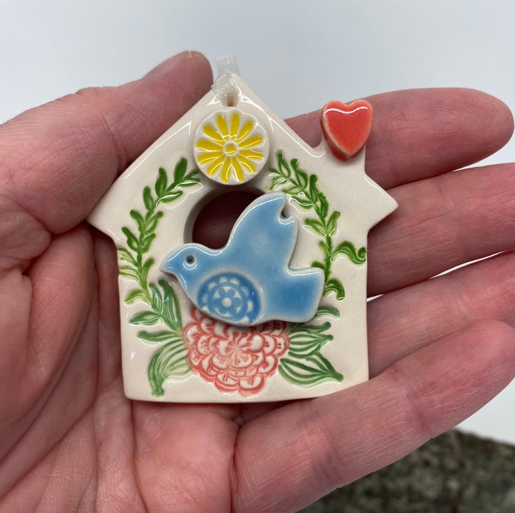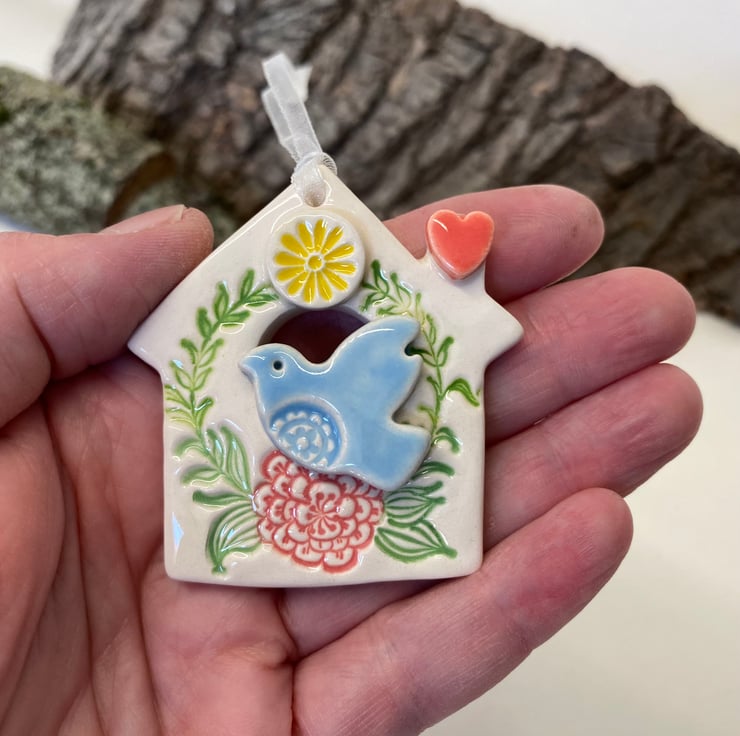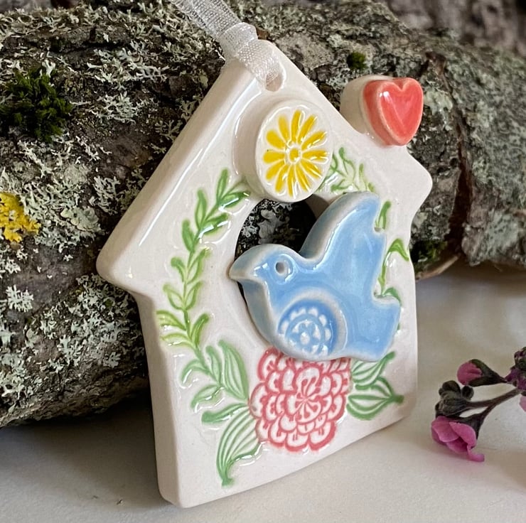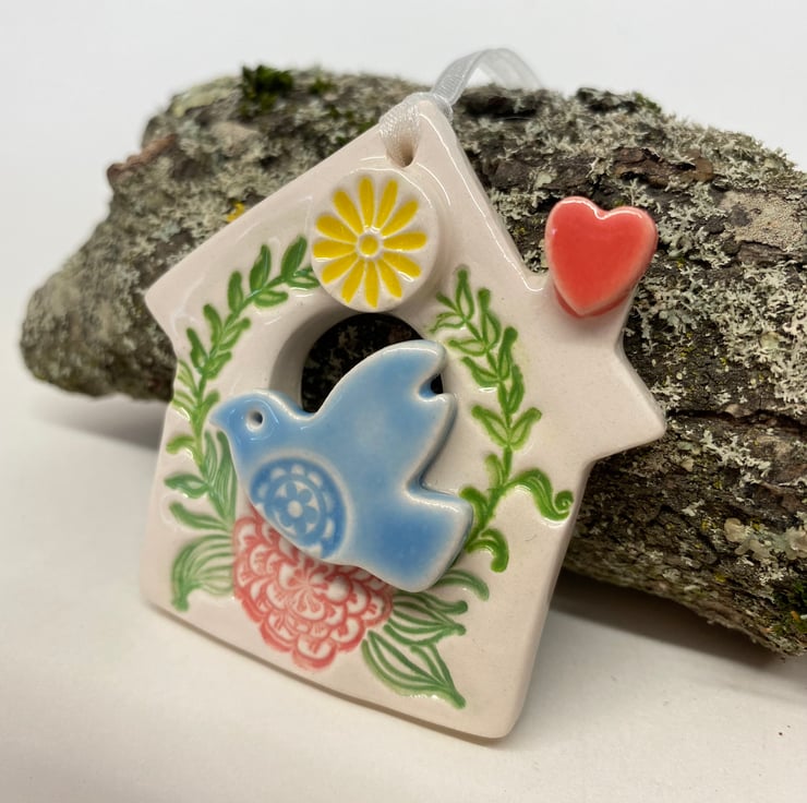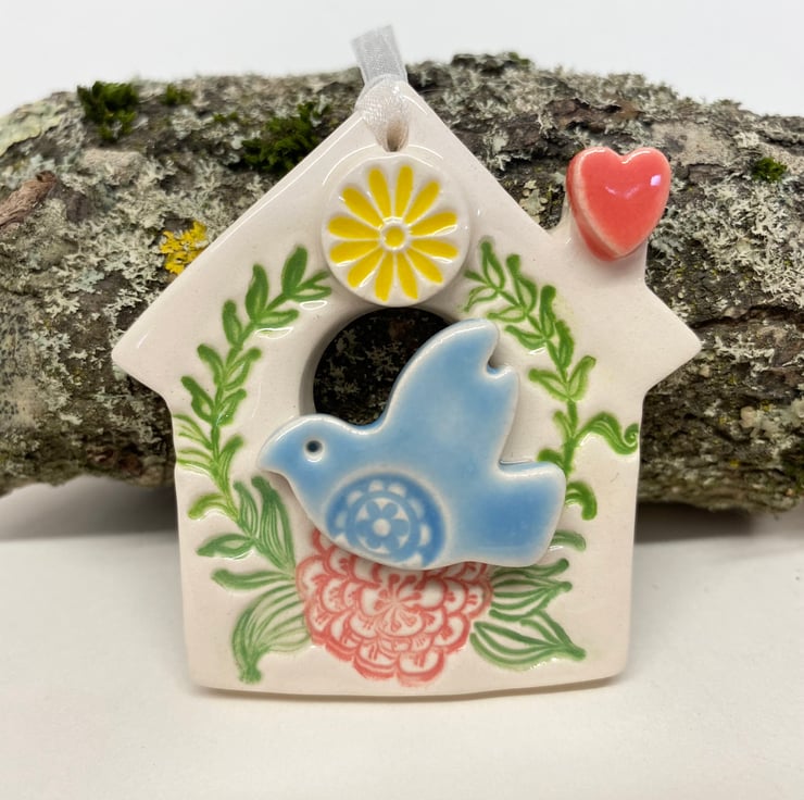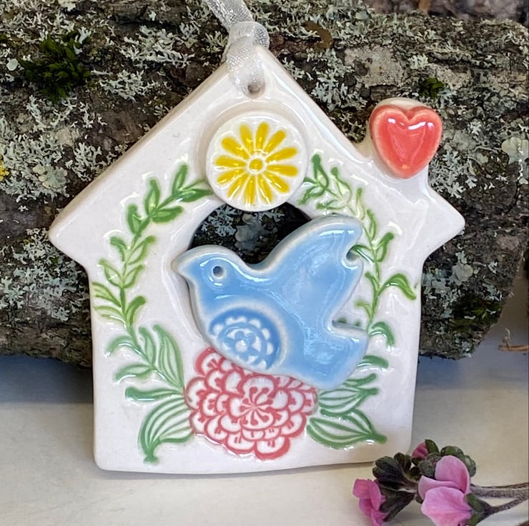 This little bird house decoration is made from white earthenware clay and finshed with a little pottery bird. It has been fired twice and finished with a glossy glaze for a lovely smooth finish. It measures 5cm x 6cm and hangs from rustic brown string