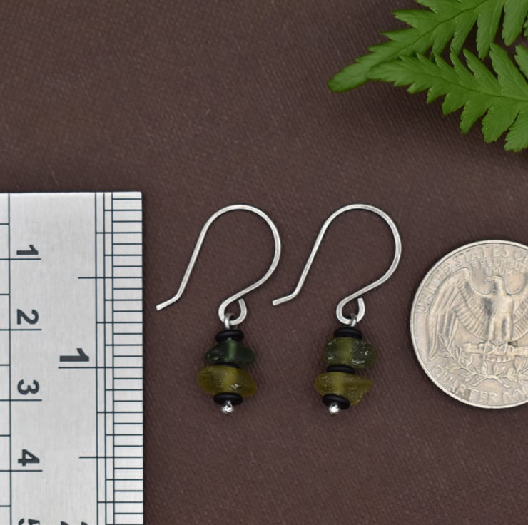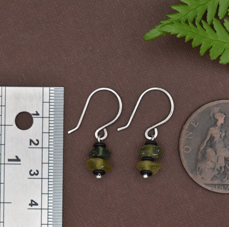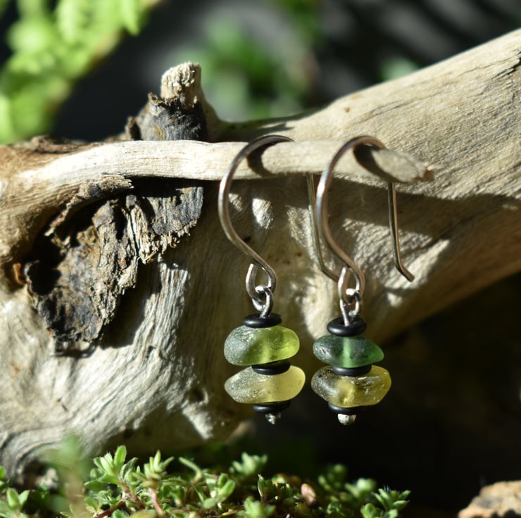 Tiny stacked earrings featuring sea glass collected locally in the Scottish Highlands. Each earring features two tiny pieces of sea glass in varying shades of green, separated by matte black Czech glass beads The handmade headpins and hooks are 925 sterling silver, and have been finished with a patina using liver of sulphur. They measure approximately 3cm from the top of the hook, and have a 'dangle length' (from the bottom of the hook) of 1.5cm