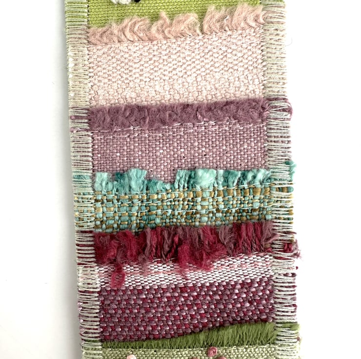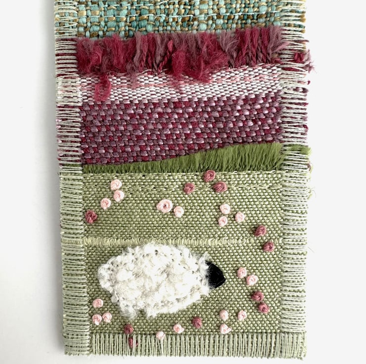 Bookmark with fields and sheep. This lovely countryside themed bookmark is made from a variety of layered fabrics. The design depicts pastures and colourful fields. I've used a pale blue and white abstract print fabric at the top, to represent a partly cloudy sky. The fields and pastures are made from many different fabrics in shades of green and pink. I've used the frayed raw edges of some of the fabric, and also used some selvedge edges, to give the impression of vegetation at the field boundaries. On the hill in the background, there is a flock of tiny sheep, which I've hand embroidered with angora yarn. I've added two dark green appliqué trees on the horizon. The foreground pasture has an appliqué, free-motion and hand embroidered sheep, surrounded by lots of tiny French knot flowers in two shades of pink. The bookmark is backed with pale green fabric with paler green flecks, and is edged with zig-zag stitching in pale green thread. It is stiffened with an inner layer of interfacing,