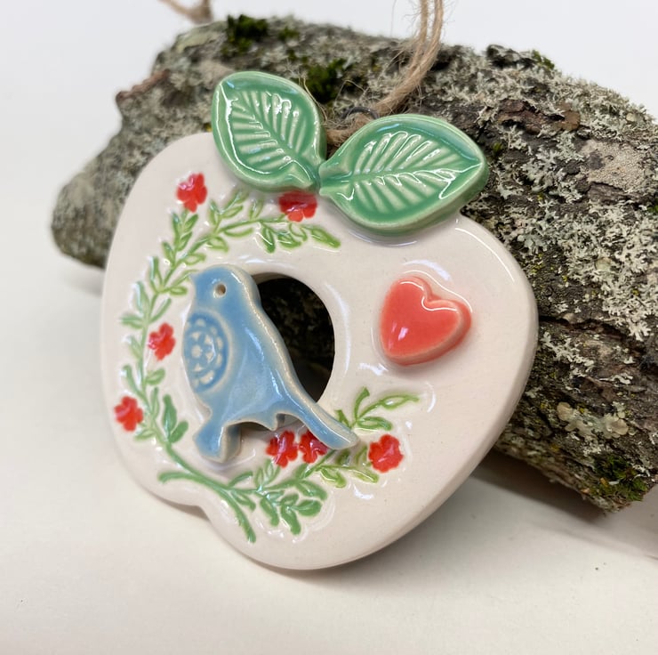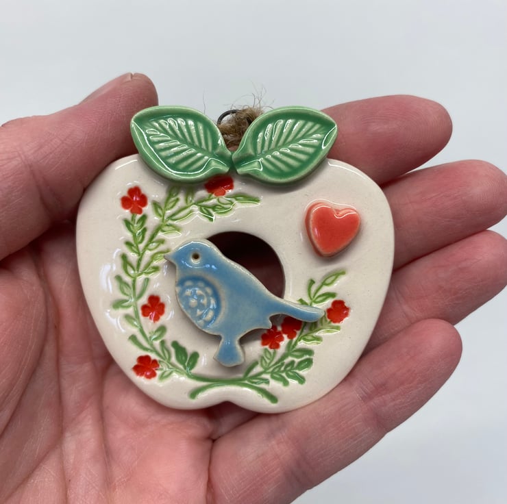 This apple is made from white earthenware clay. It has been imprinted with a flower design and filled with bright glaze. It has been fired twice in an electric kiln, once to the bisque stage and then a second firing for the clear glaze. It measures 5.5cm wide x 5cm height x 1cm thick. It can be hung outside.