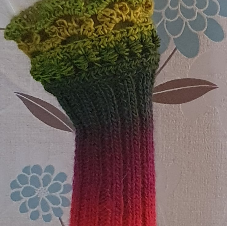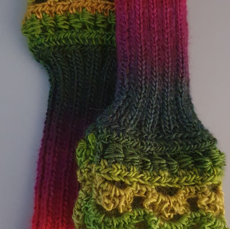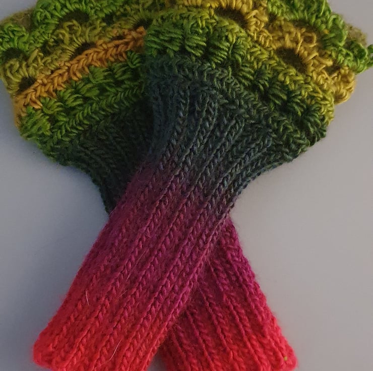 A combination of hand knitting and crochet makes these wristlets both unusual and striking.