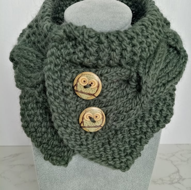 Cable knit neck warmer in khaki green with wided-eyed owl button closing.