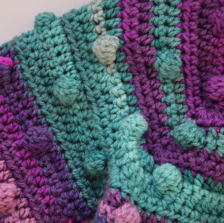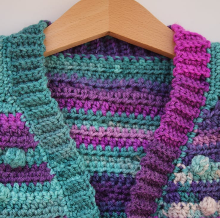 A beautiful bobble pattern cardigan with a gorgeous colour pallet that is perfect for wearing all year round.